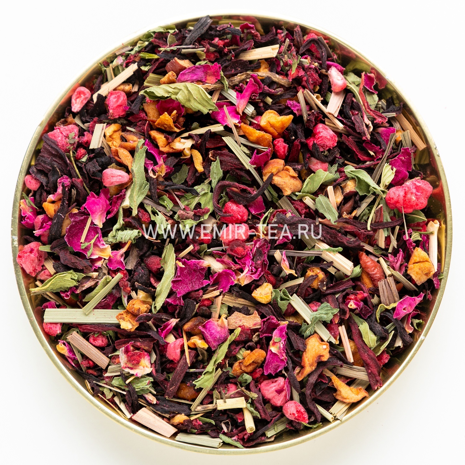 Состав: Каркаде резанный, лист ежевики, лимонная трава, кусочки сублимированной малины, лист мяты, кусочки сушеного яблока, лепестки розы. Содержит пищевые ароматические масла.
