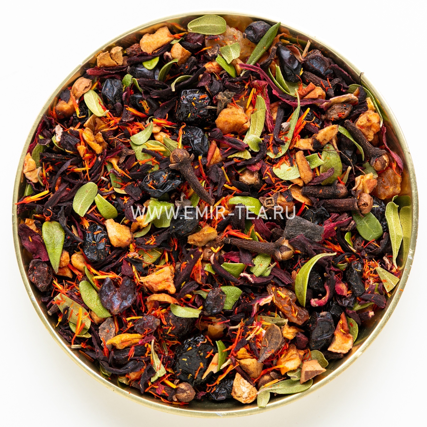 Состав: Каркаде резанный, барбарис, вишня сушеная, кусочки сушеного яблока, лепестки сафлора, гвоздика, лист брусники, изюм. Содержит пищевые ароматические масла.