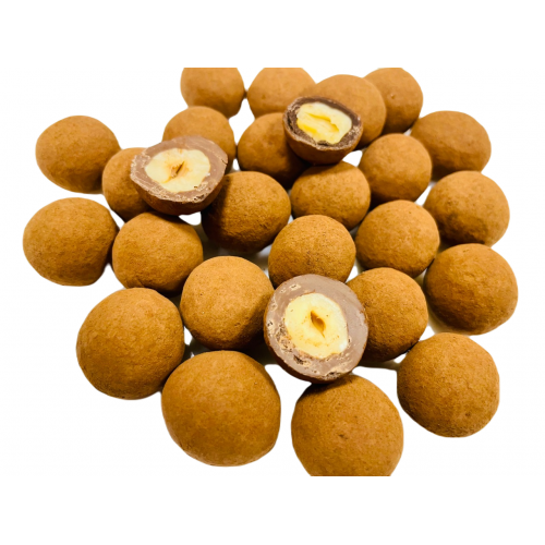 Фундук в молочной шоколадной глазури и в бархатной какао обсыпке.