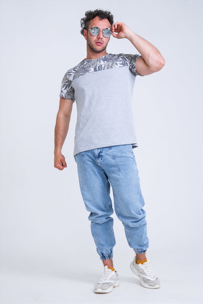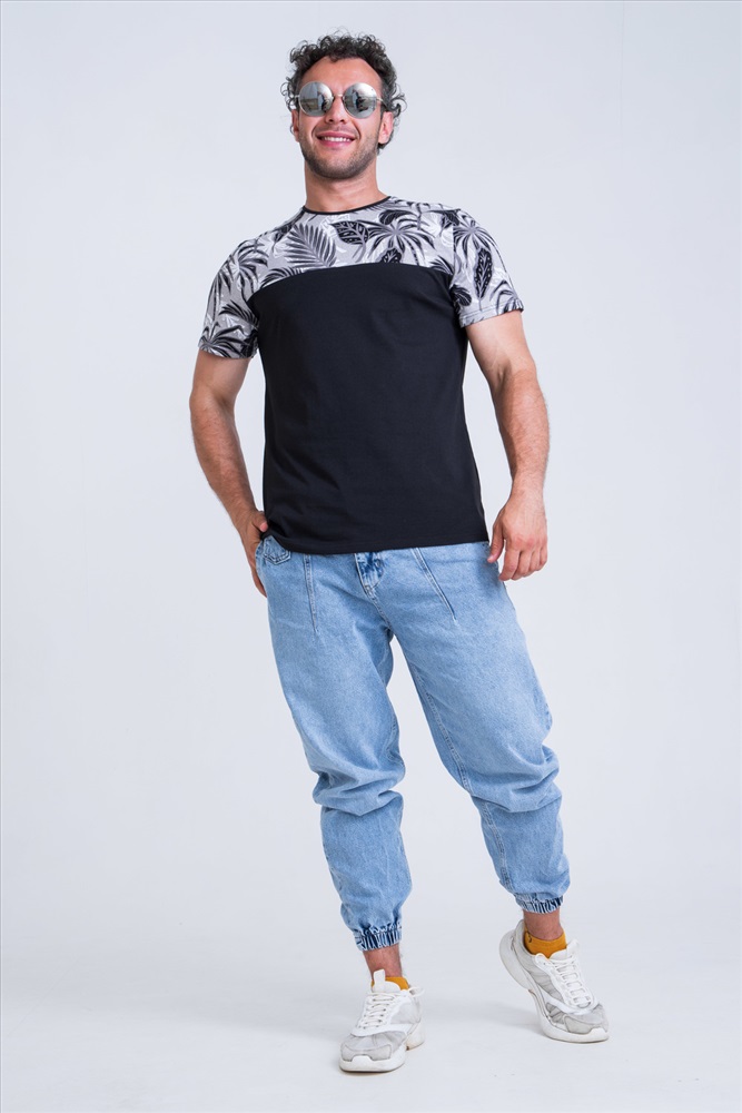 Мужская футболка с круглым вырезом горловины. Выполнена в двух расцветах. Спинка горловины усилена бейкой из основного полотна. Вырез горловины закрыт декоративной обтачкой.