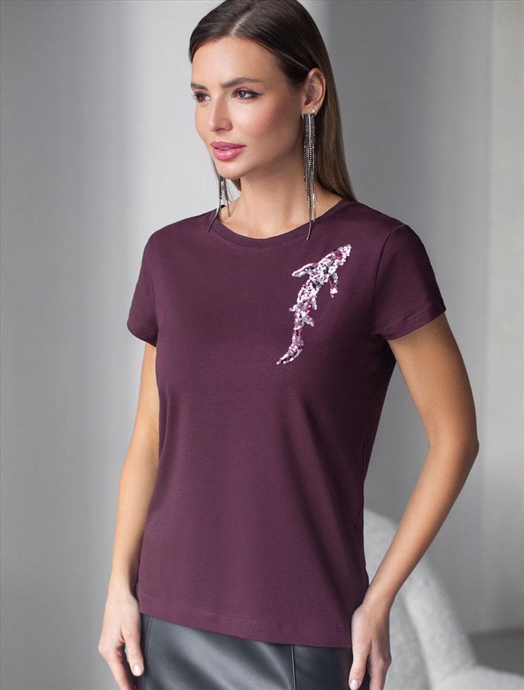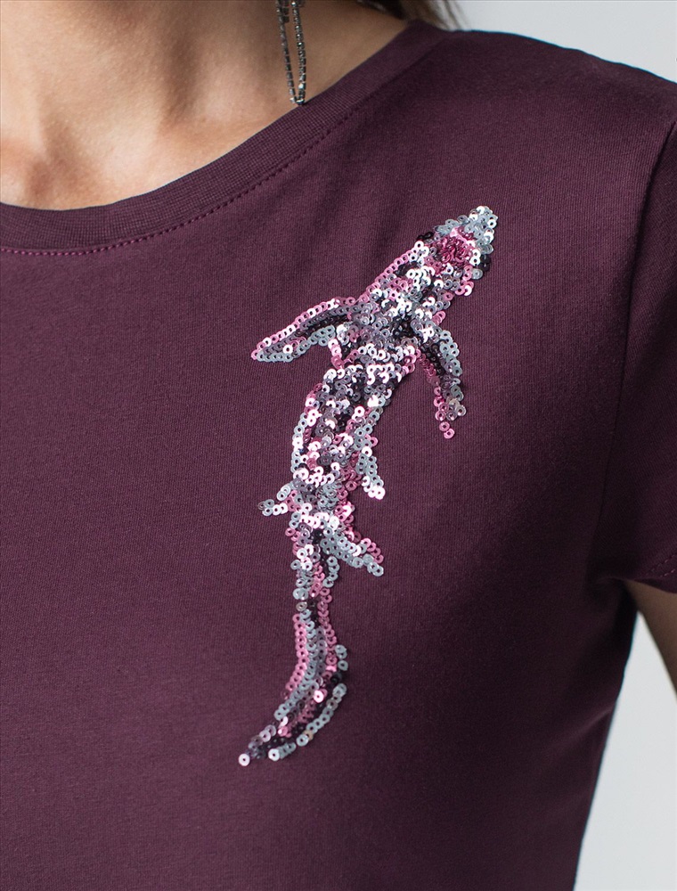 Футболка цвета бургунди идеально подходит для вечеринки и создания яркого образа. Оригинальный принт из ярких пайеток в виде рыбки придает изделию шикарный вид, который привлечет внимание на любом мероприятии. Модель с круглым вырезом и классическим коротким рукавом обеспечивает свободу движений и комфорт в носке. Такой фасон изделия подходит на большие размеры, гармонично сидит на фигуре и помогает создать легкий акцент на достоинствах. Аккуратный круглый вырез красиво подчеркивает шею и делает образ элегантным, сохраняя актуальность для разных случаев — от рабочих встреч до вечерних прогулок и праздничных мероприятий.