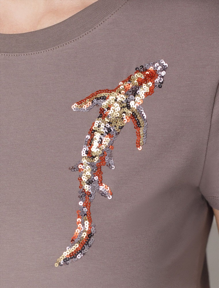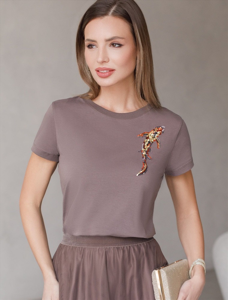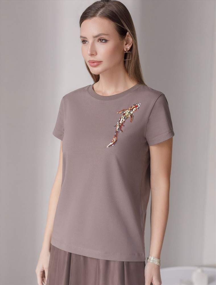 Футболка кофейного цвета идеально подходит для вечеринки и создания яркого образа. Оригинальный принт из пайеток в виде рыбки придает изделию шикарный вид, который привлечет внимание на любом мероприятии. Модель с круглым вырезом и классическим коротким рукавом обеспечивает свободу движений и комфорт в носке. Такой фасон изделия подходит на большие размеры, гармонично сидит на фигуре и помогает создать легкий акцент на достоинствах. Аккуратный круглый вырез красиво подчеркивает шею и делает образ элегантным, сохраняя актуальность для разных случаев — от рабочих встреч до вечерних прогулок и праздничных мероприятий.