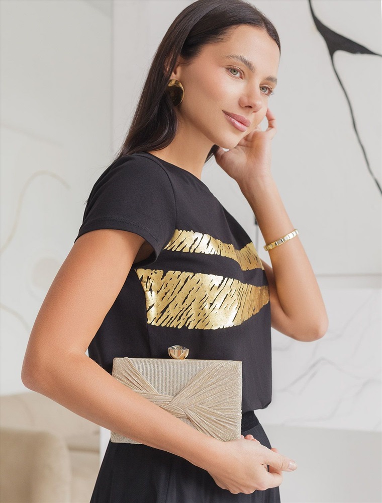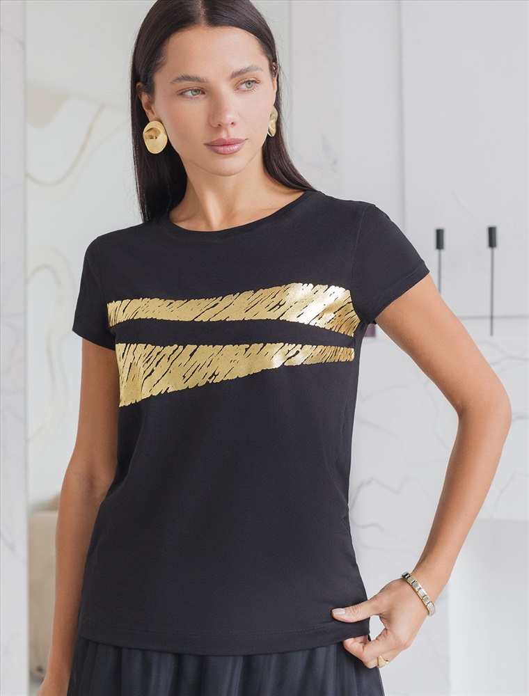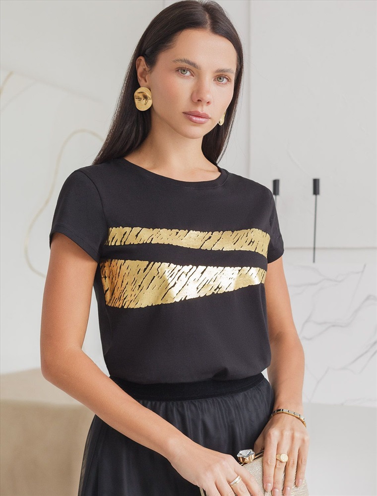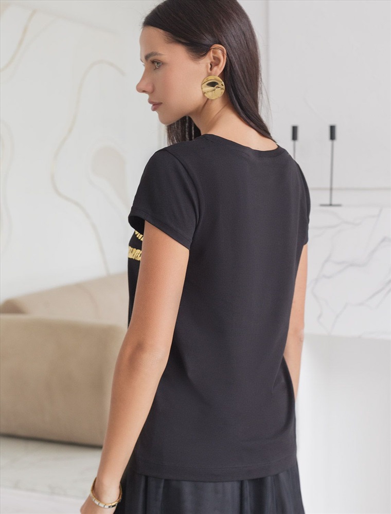 Футболка черного цвета идеально подходит для вечеринки и создания яркого образа. Оригинальный принт из фольги золотистого цвета придает изделию шикарный вид, который привлечет внимание на любом мероприятии. Модель с круглым вырезом и классическим коротким рукавом обеспечивает свободу движений и комфорт в носке. Такой фасон изделия подходит на большие размеры, гармонично сидит на фигуре и помогает создать легкий акцент на достоинствах. Аккуратный круглый вырез красиво подчеркивает шею и делает образ элегантным, сохраняя актуальность для разных случаев — от рабочих встреч до вечерних прогулок и праздничных мероприятий.