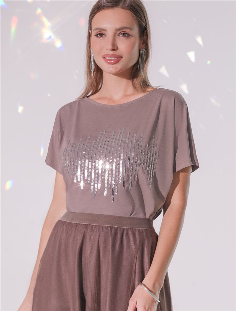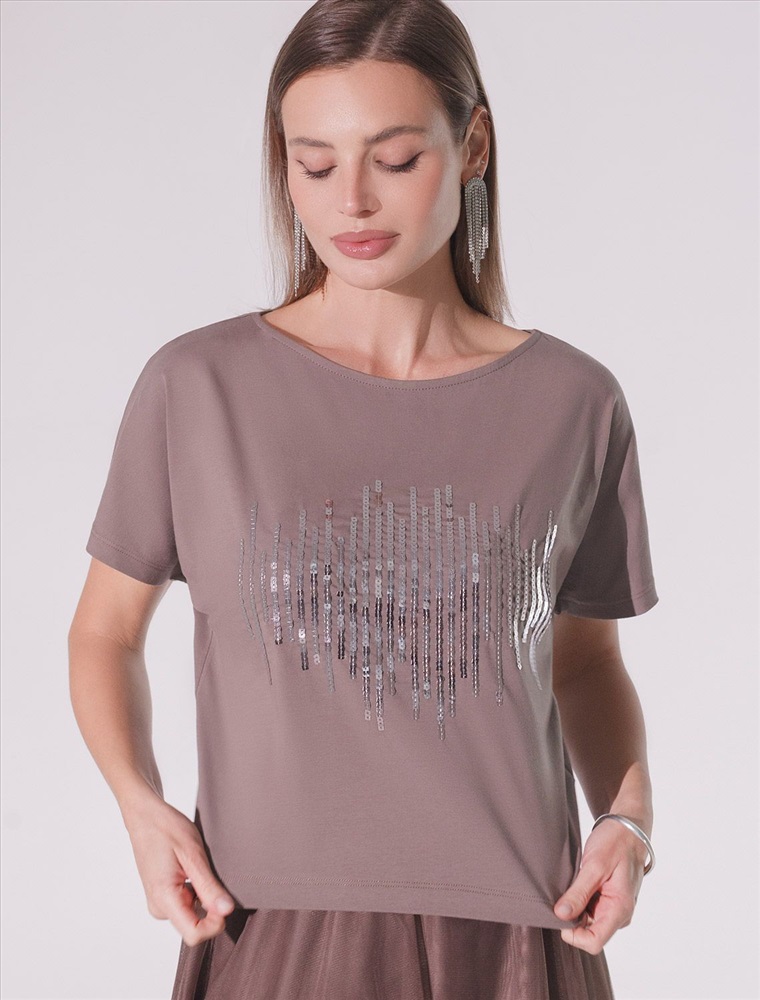 Футболка кофейного цвета идеально подходит для вечеринки и создания яркого образа. Оригинальный принт из блестящих пайеток в виде дождика придает изделию шикарный вид, который привлечет внимание на любом мероприятии. Модель с вырезом лодочка и цельнокроеным рукавом обеспечивает свободу движений и комфорт в носке. Такой фасон изделия подходит на большие размеры, гармонично сидит на фигуре и помогает создать легкий акцент на достоинствах. Благодаря особенностям кроя с цельнокроеным рукавом удается искусно скроет любые возможные недостатки в области плеч и рук, обеспечивая комфортное прилегание без ощущения скованности. Аккуратный вырез лодочка красиво подчеркивает шею и делает образ элегантным, сохраняя актуальность для разных случаев — от рабочих встреч до вечерних прогулок и праздничных мероприятий.