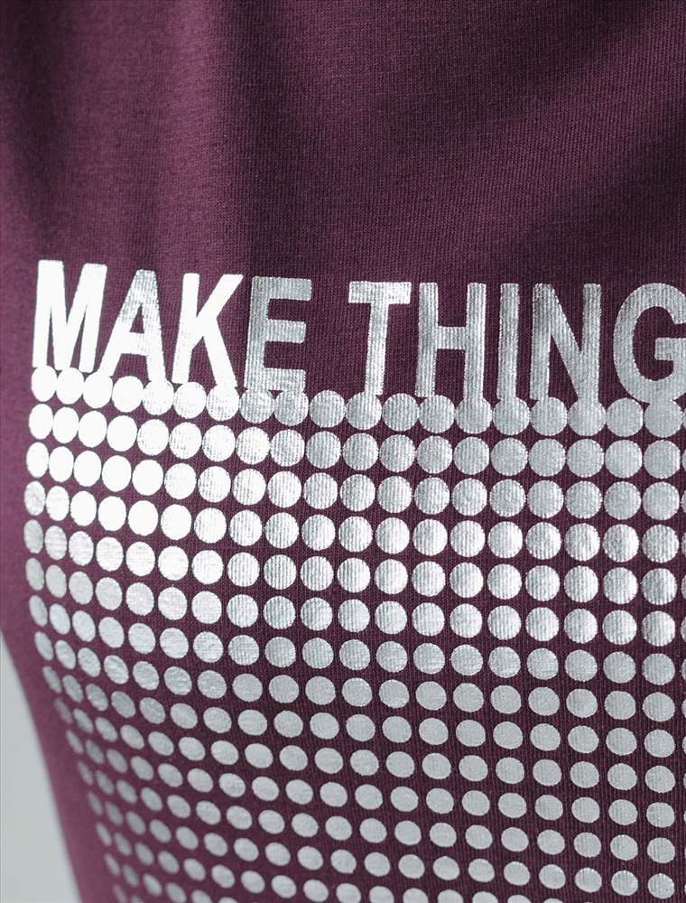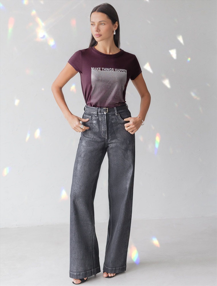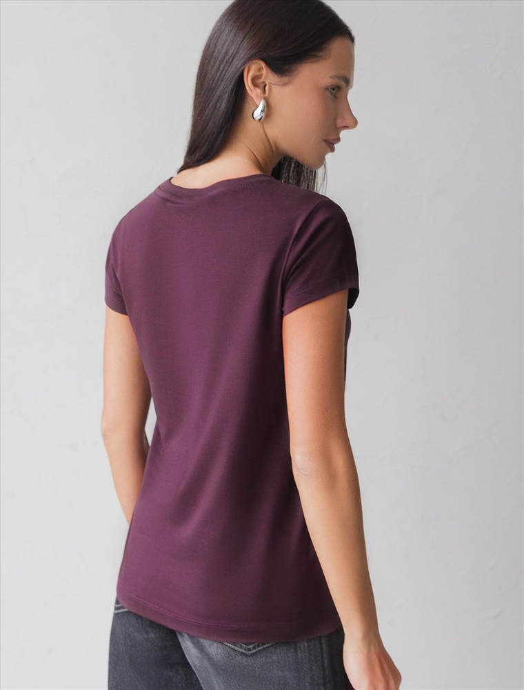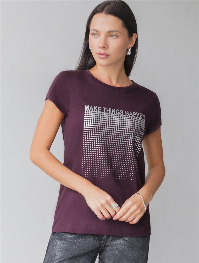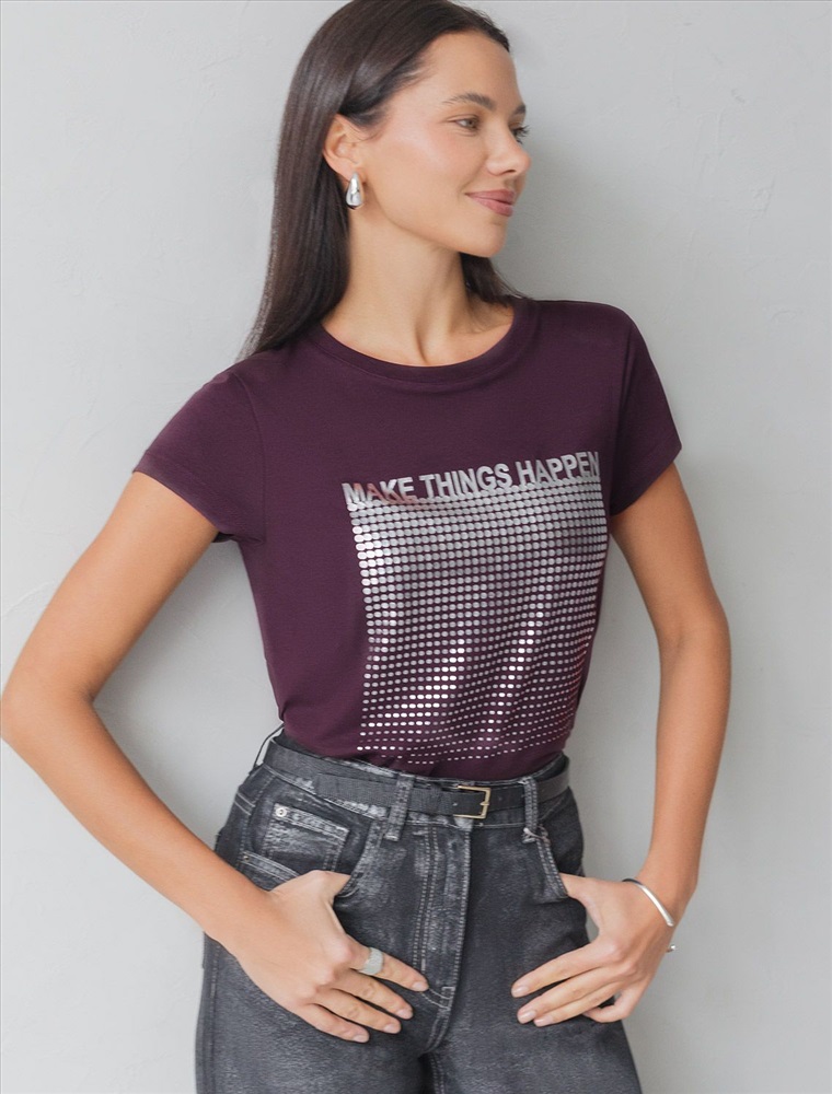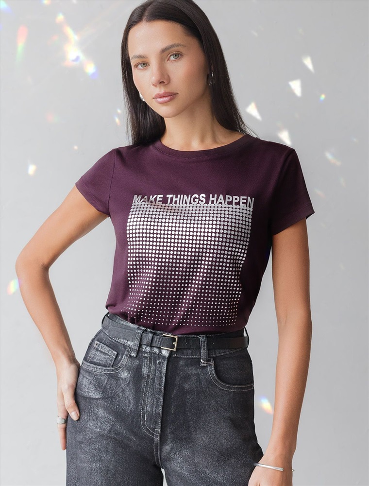 Футболка цвета бургунди идеально подходит для вечеринки и создания яркого образа. Оригинальный принт из фольги серебристого цвета придает изделию шикарный вид, который привлечет внимание на любом мероприятии. . Модель с круглым вырезом и классическим коротким рукавом обеспечивает свободу движений и комфорт в носке. Такой фасон изделия подходит на большие размеры, гармонично сидит на фигуре и помогает создать легкий акцент на достоинствах. Аккуратный круглый вырез красиво подчеркивает шею и делает образ элегантным, сохраняя актуальность для разных случаев — от рабочих встреч до вечерних прогулок и праздничных мероприятий.