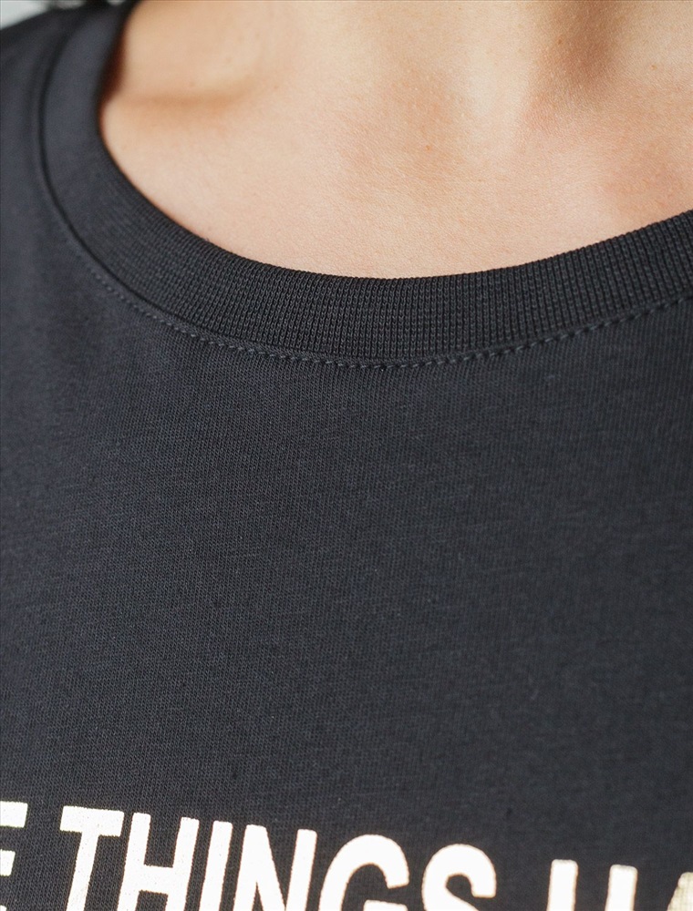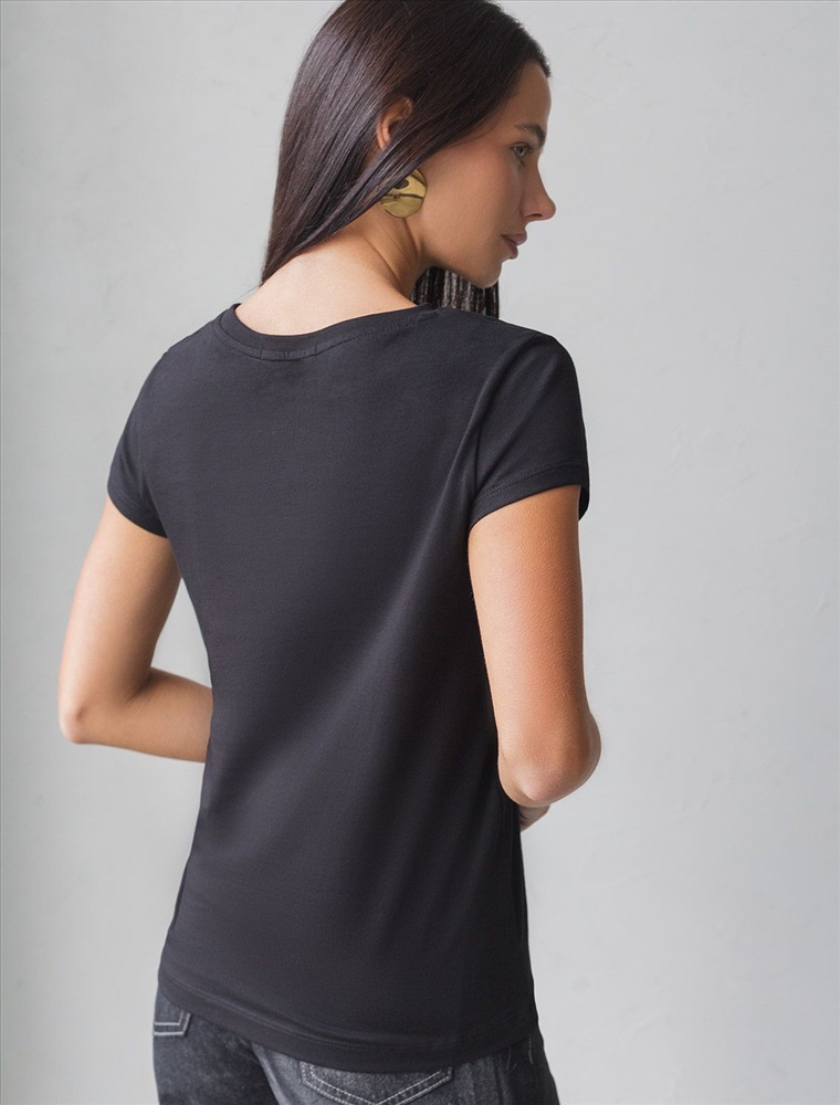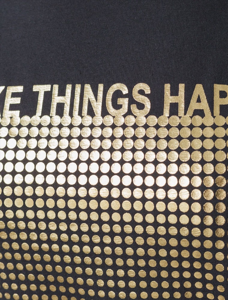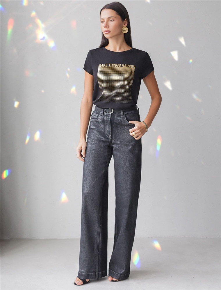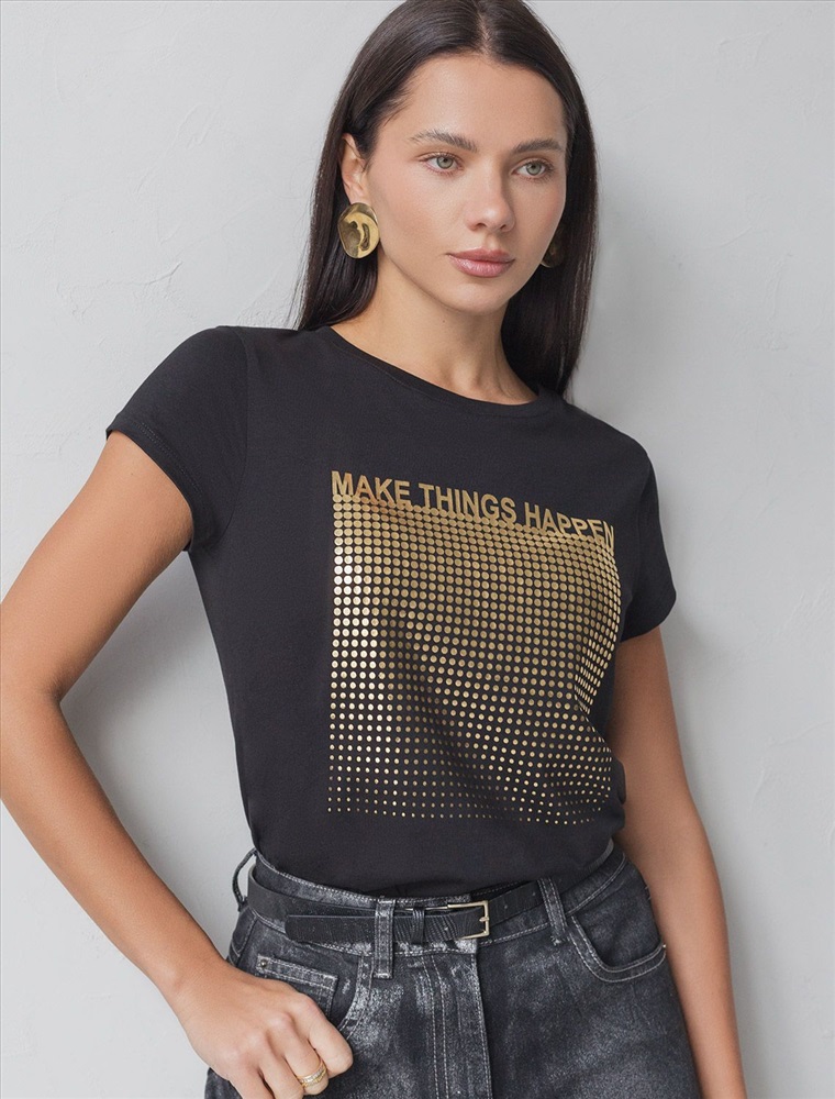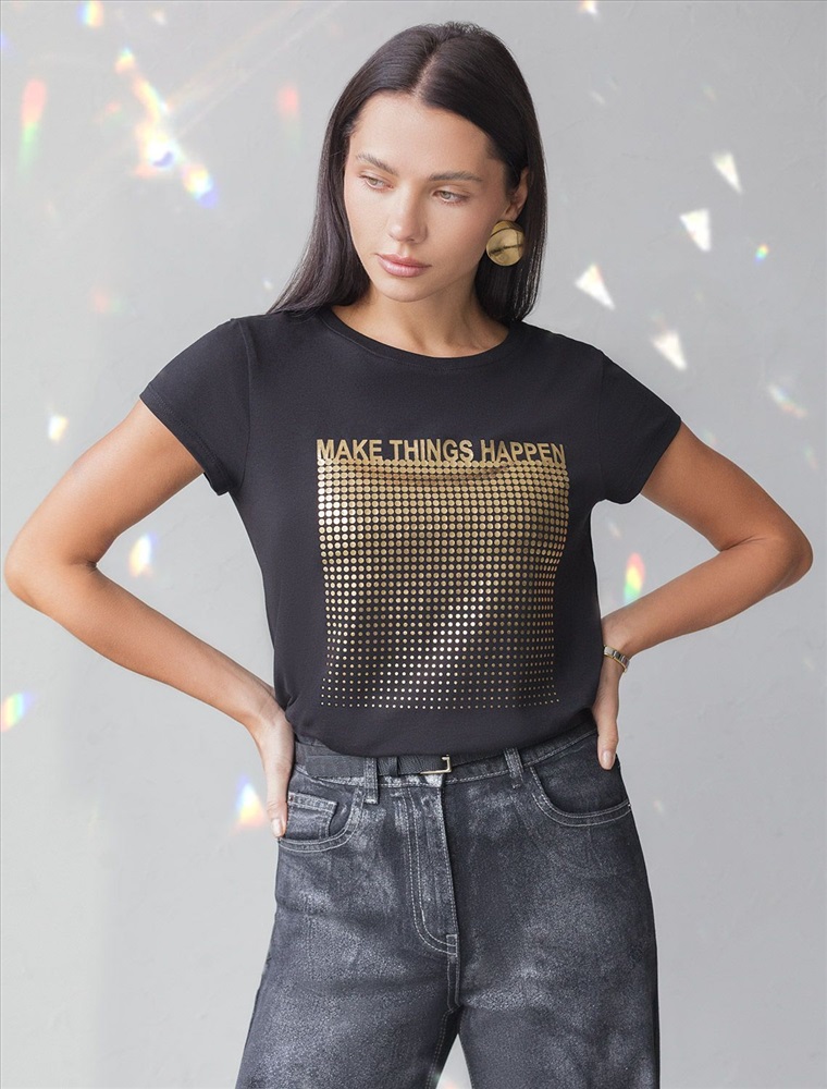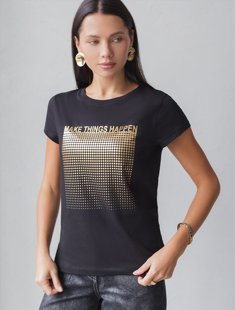 Футболка черного цвета идеально подходит для вечеринки и создания яркого образа. Оригинальный принт из фольги золотистого цвета придает изделию шикарный вид, который привлечет внимание на любом мероприятии. Модель с круглым вырезом и классическим коротким рукавом обеспечивает свободу движений и комфорт в носке. Такой фасон изделия подходит на большие размеры, гармонично сидит на фигуре и помогает создать легкий акцент на достоинствах. Аккуратный круглый вырез красиво подчеркивает шею и делает образ элегантным, сохраняя актуальность для разных случаев — от рабочих встреч до вечерних прогулок и праздничных мероприятий.