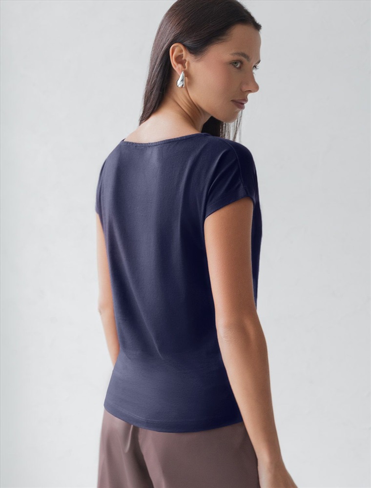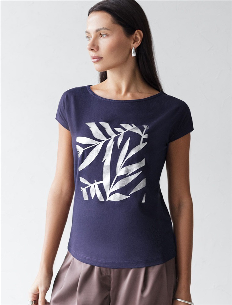 Футболка темно-синего цвета идеально подходит для вечеринки и создания яркого образа. Оригинальный блестящий принт из фольги серебристого цвета в виде листиков придает изделию шикарный вид, который привлечет внимание на любом мероприятии. Модель с вырезом лодочка и цельнокроеным коротким рукавом обеспечивает свободу движений и комфорт в носке. Такой фасон изделия подходит на большие размеры, гармонично сидит на фигуре и помогает создать легкий акцент на достоинствах. Аккуратный вырез лодочка красиво подчеркивает шею и делает образ элегантным, сохраняя актуальность для разных случаев — от рабочих встреч до вечерних прогулок и праздничных мероприятий.