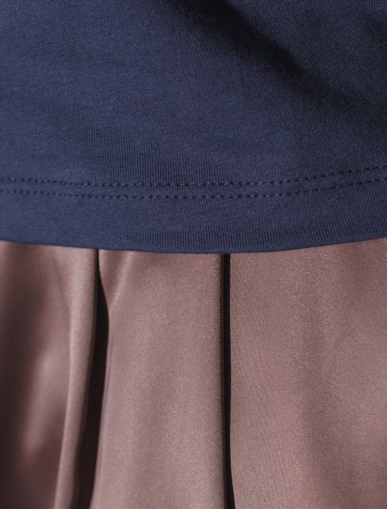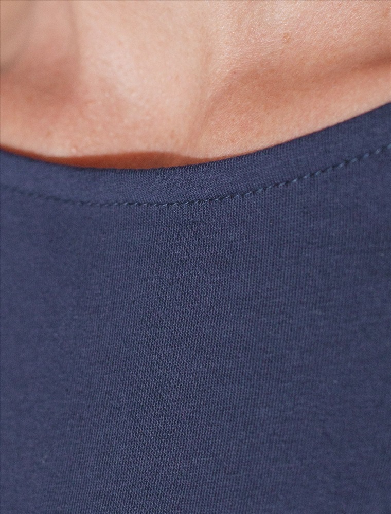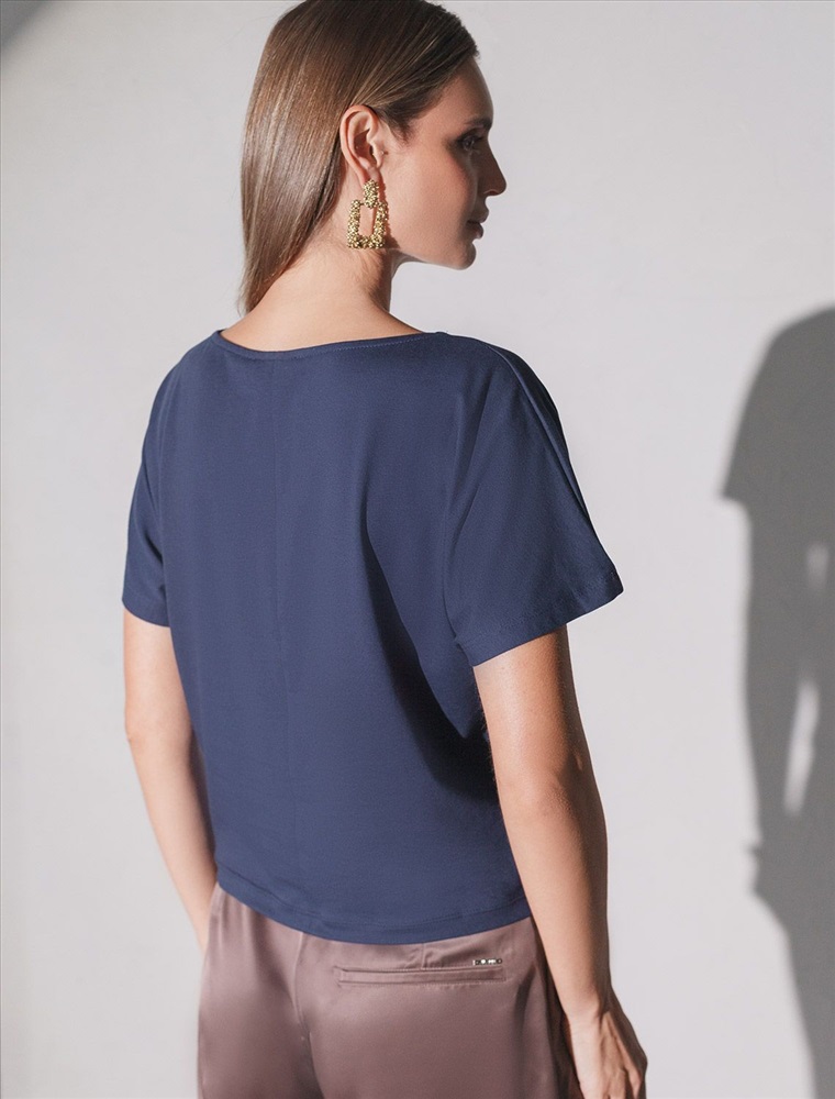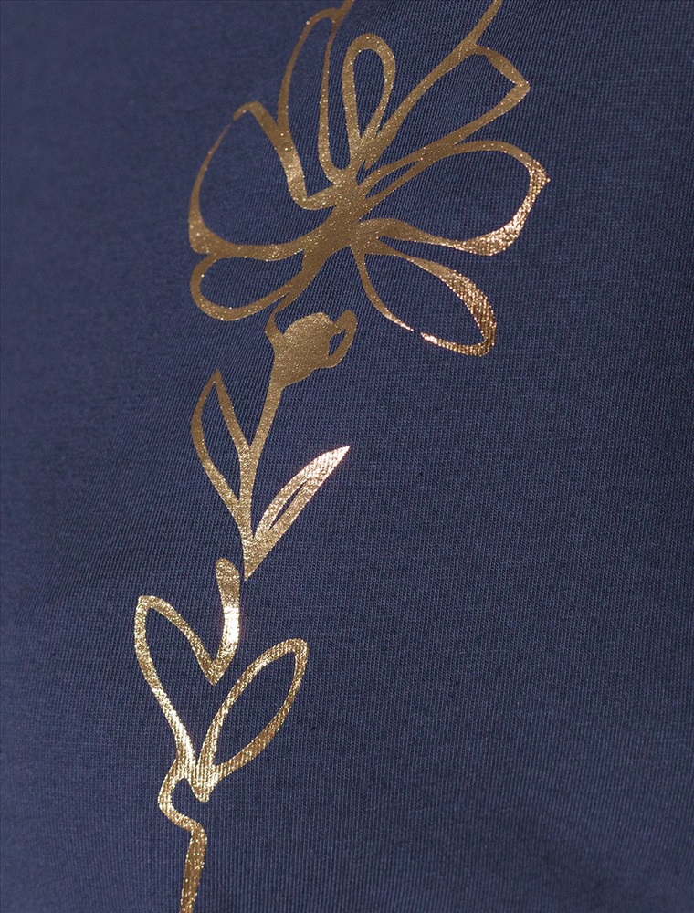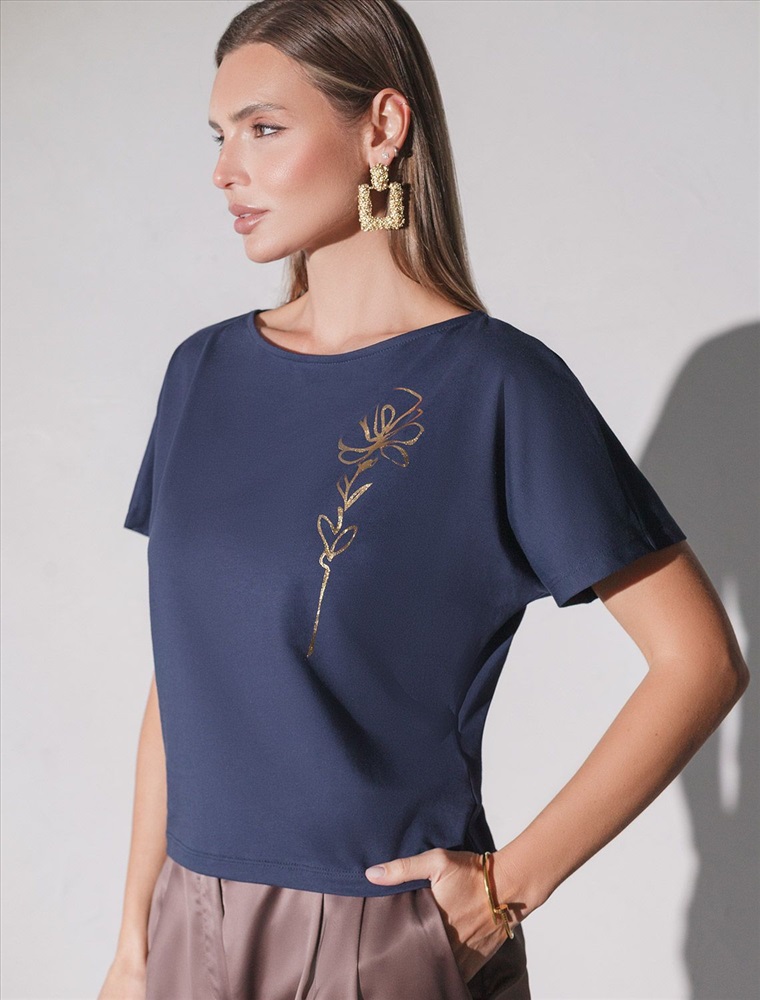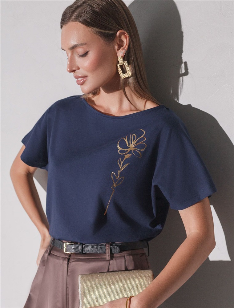 Футболка темно-синего цвета идеально подходит для вечеринки и создания яркого образа. Оригинальный блестящий принт из фольги в виде цветка придает изделию шикарный вид, который привлечет внимание на любом мероприятии. Модель с вырезом лодочка и цельнокроеным рукавом обеспечивает свободу движений и комфорт в носке. Такой фасон изделия подходит на большие размеры, гармонично сидит на фигуре и помогает создать легкий акцент на достоинствах. Благодаря особенностям кроя с цельнокроеным рукавом удается искусно скроет любые возможные недостатки в области плеч и рук, обеспечивая комфортное прилегание без ощущения скованности. Аккуратный вырез лодочка красиво подчеркивает шею и делает образ элегантным, сохраняя актуальность для разных случаев — от рабочих встреч до вечерних прогулок и праздничных мероприятий.