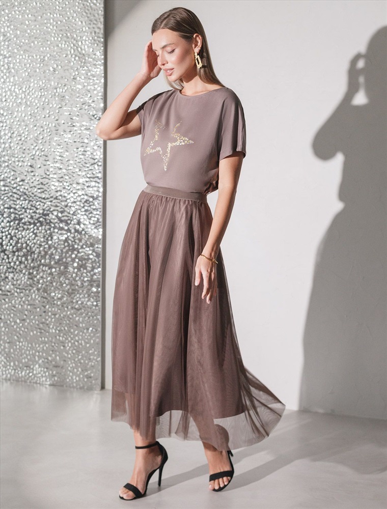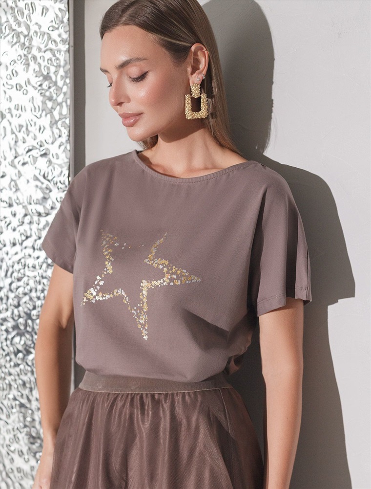 Футболка кофейного цвета идеально подходит для вечеринки и создания яркого образа. Оригинальный принт из блестящей фольги в виде звезды придает изделию шикарный вид, который привлечет внимание на любом мероприятии. Модель с вырезом лодочка и цельнокроеным рукавом обеспечивает свободу движений и комфорт в носке. Такой фасон изделия подходит на большие размеры, гармонично сидит на фигуре и помогает создать легкий акцент на достоинствах. Благодаря особенностям кроя с цельнокроеным рукавом удается искусно скроет любые возможные недостатки в области плеч и рук, обеспечивая комфортное прилегание без ощущения скованности. Аккуратный вырез лодочка красиво подчеркивает шею и делает образ элегантным, сохраняя актуальность для разных случаев — от рабочих встреч до вечерних прогулок и праздничных мероприятий.