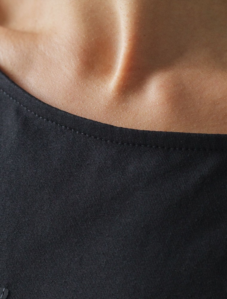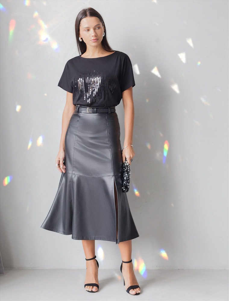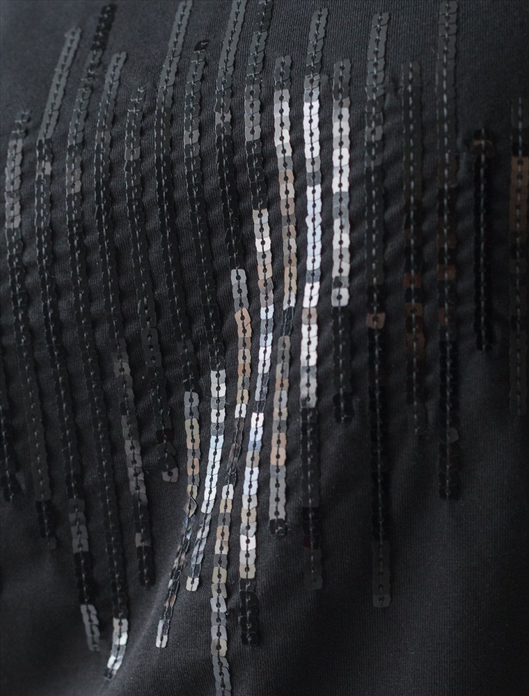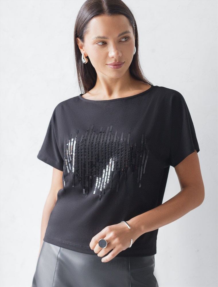 Футболка черного цвета идеально подходит для вечеринки и создания яркого образа. Оригинальный блестящий принт из пайеток в виде дождика придает изделию шикарный вид, который привлечет внимание на любом мероприятии. Модель с вырезом лодочка и цельнокроеным рукавом обеспечивает свободу движений и комфорт в носке. Такой фасон изделия подходит на большие размеры, гармонично сидит на фигуре и помогает создать легкий акцент на достоинствах. Благодаря особенностям кроя с цельнокроеным рукавом удается искусно скроет любые возможные недостатки в области плеч и рук, обеспечивая комфортное прилегание без ощущения скованности. Аккуратный вырез лодочка красиво подчеркивает шею и делает образ элегантным, сохраняя актуальность для разных случаев — от рабочих встреч до вечерних прогулок и праздничных мероприятий.