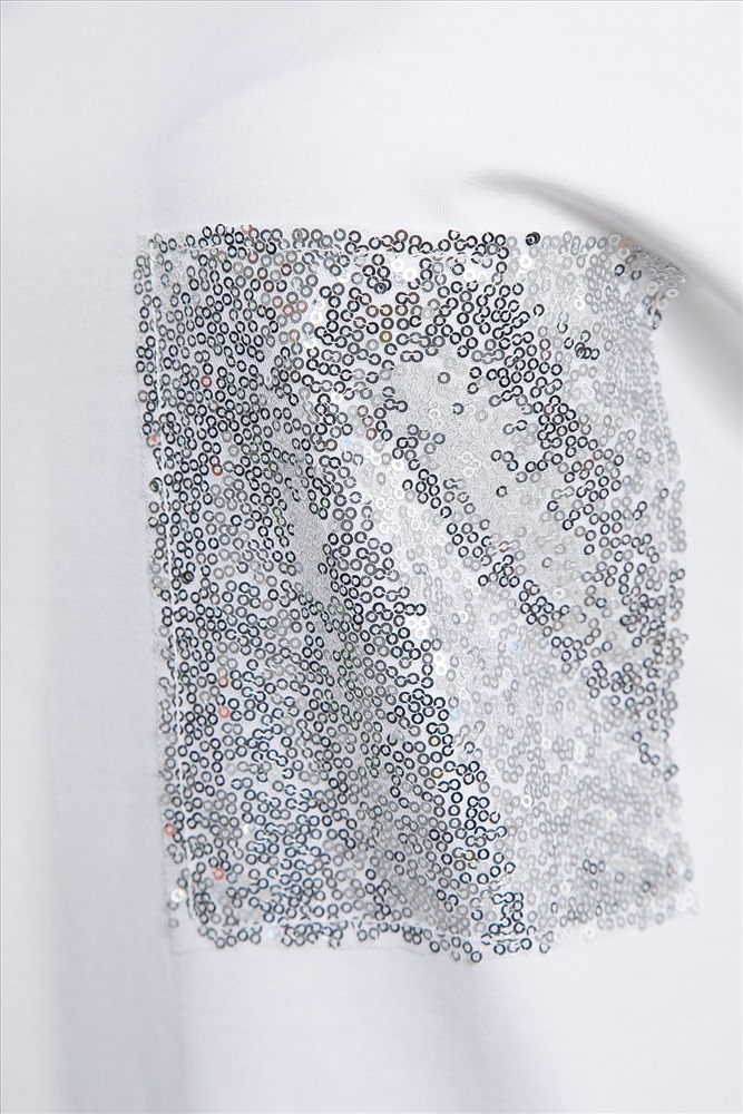 Белая футболка с ассиметричным кроем — станет настоящим украшением вашего гардероба! Она имеет оригинальный дизайн с имитацией кармана на груди, который украшен пайетками. Такая футболка подойдёт как для повседневных образов, так и для особых случаев. Свободный силуэт обеспечивает свободу движений и комфорт. Она прекрасно сочетается с джинсами и юбками, позволяя создавать разнообразные стильные образы.