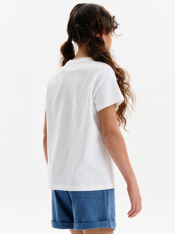 Состав: 100%хлопок Футболка для девочки маленького объема. Выполнена из 100% хлопка. Эластичная рибана на вырезе горловины гарантирует, что футболка будет легко надеваться и сниматься, не теряя при этом своей формы. Перевод: давайте просто повеселимся. Комментарии к товару