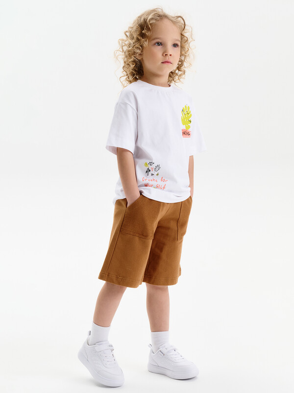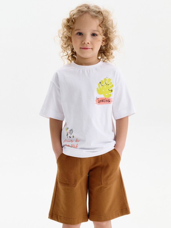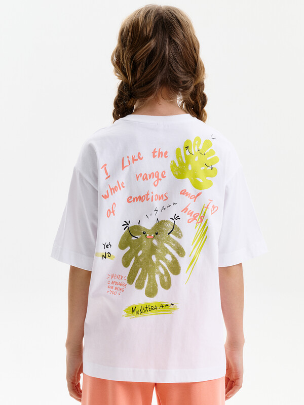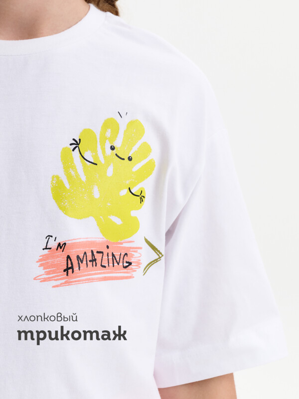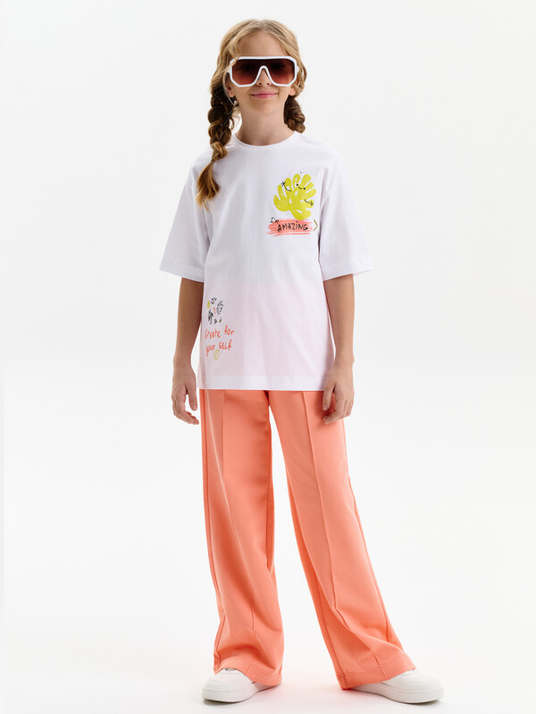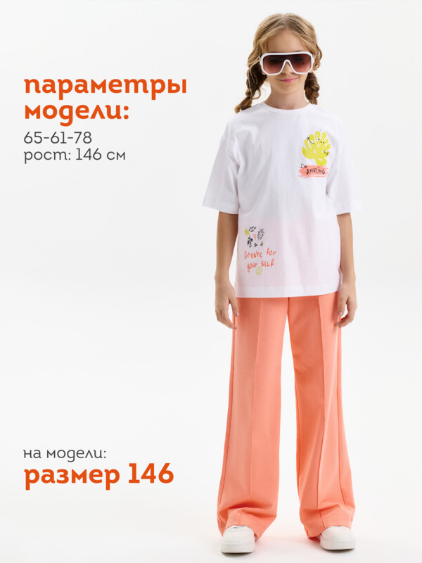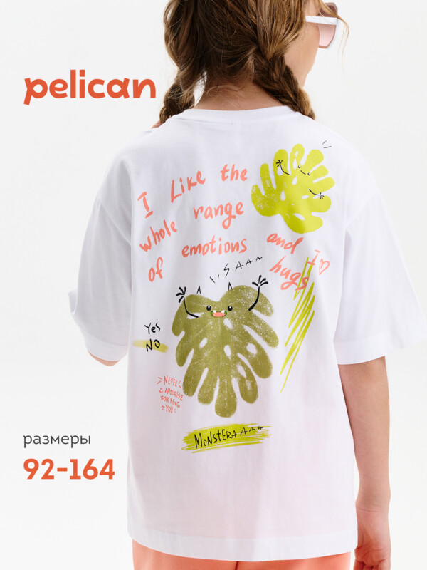 Футболка для девочки умеренного объема. Выполнена из 100% хлопка. Эластичная рибана на вырезе горловины гарантирует, что футболка будет легко надеваться и сниматься, не теряя при этом своей формы. Перевод спереди: Я УДИВИТЕЛЬНАЯ; ТВОРИ ДЛЯ СЕБЯ. Перевод на спинке: МНЕ НРАВИТСЯ ВЕСЬ СПЕКТР ЭМОЦИЙ; И Я ЛЮБЛЮ ОБНИМАШКИ; НИКОГДА НЕ ИЗВИНЯЙСЯ ЗА ТО ЧТО ТЫ ЭТО ТЫ.