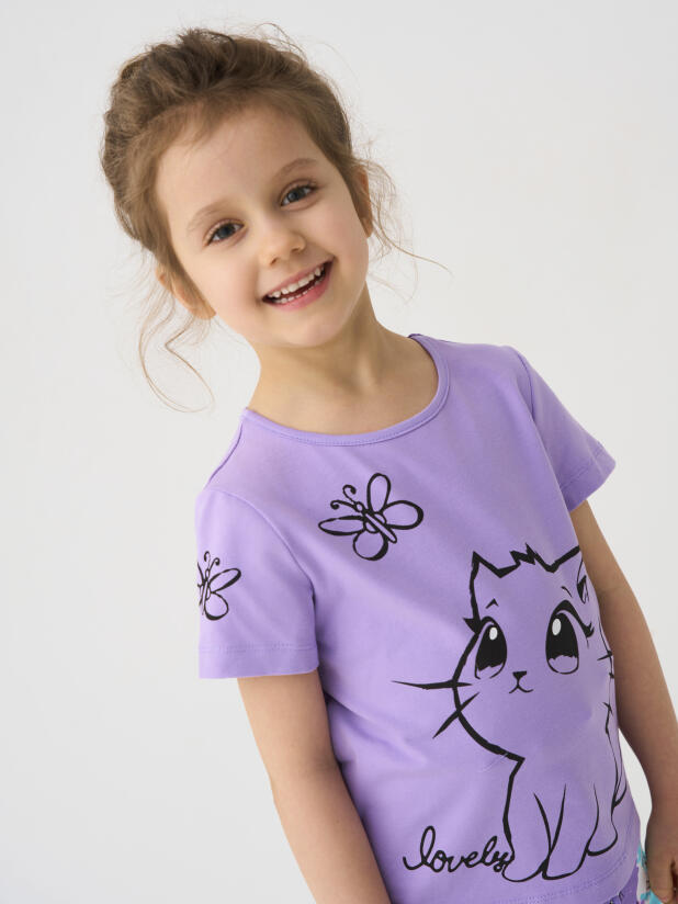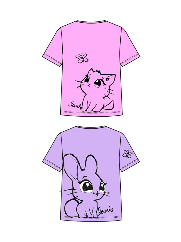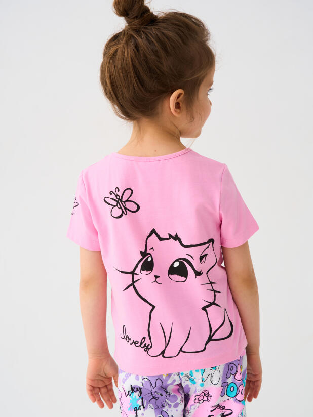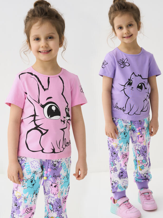 Набор детских футболок для девочки. Комплект из 2 футболок выполнен из хлопкового трикотажа джерси. Принты с милыми кроликом и котенком.