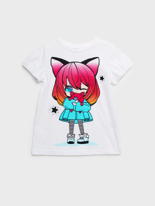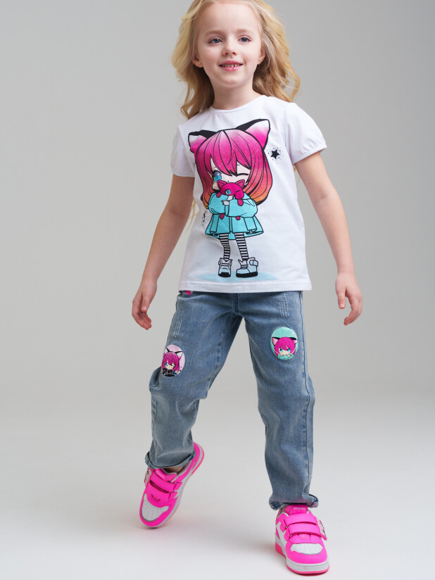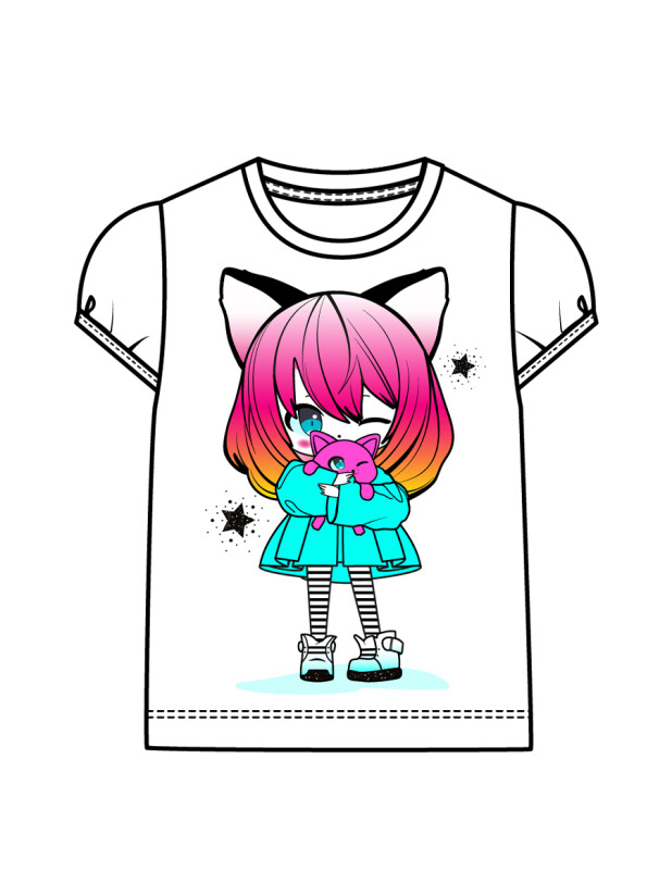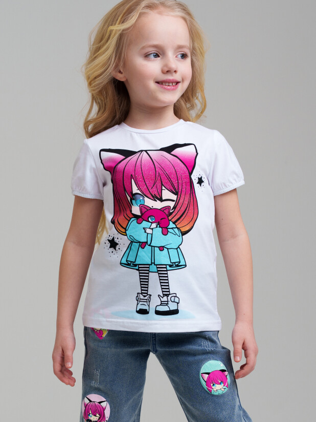 Футболка детская модная. Модель из качественного и приятного на ощупь трикотажа джерси. Футболка с высоким содержанием хлопка 95%. Благодаря наличию эластана в составе ткани изделие проще в уходе и держит форму. Модель из капсульной коллекции CATS DREAM. Соберите полный образ в едином стиле! Модель выполнена из качественного и приятного на ощупь трикотажа.