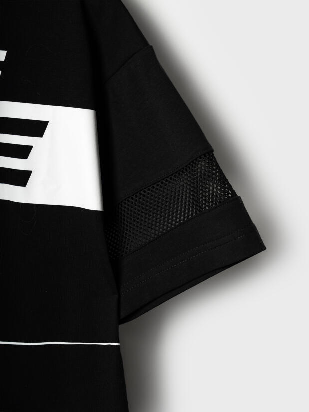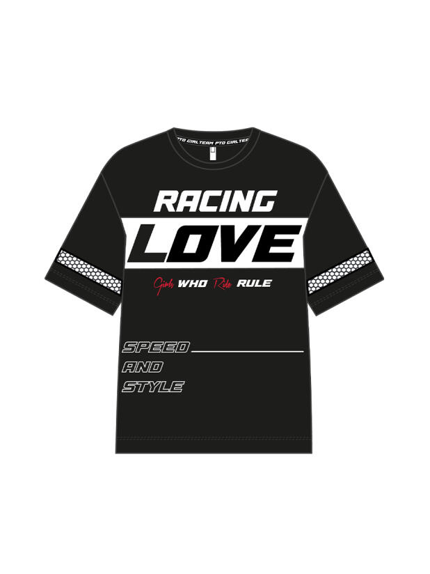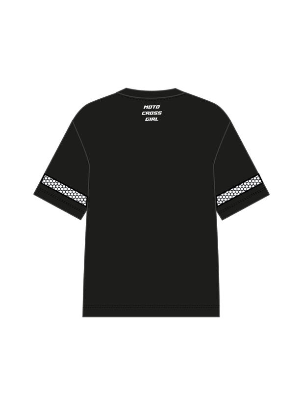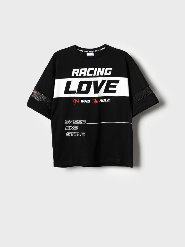 Футболка оверсайз для девочки подростка. Модель выполнена из эластичного хлопкового трикотажа джерси. На груди расположен крупный принт в гоночной тематике. Горловина круглая. Рукава со ставками из сетки.