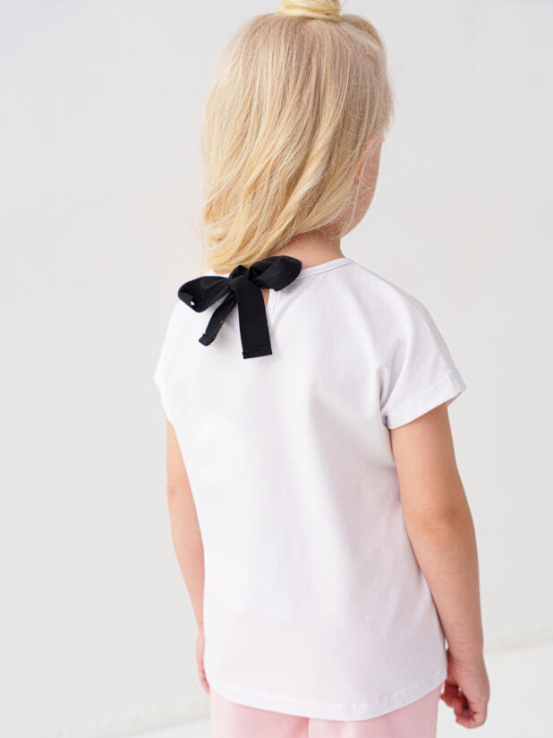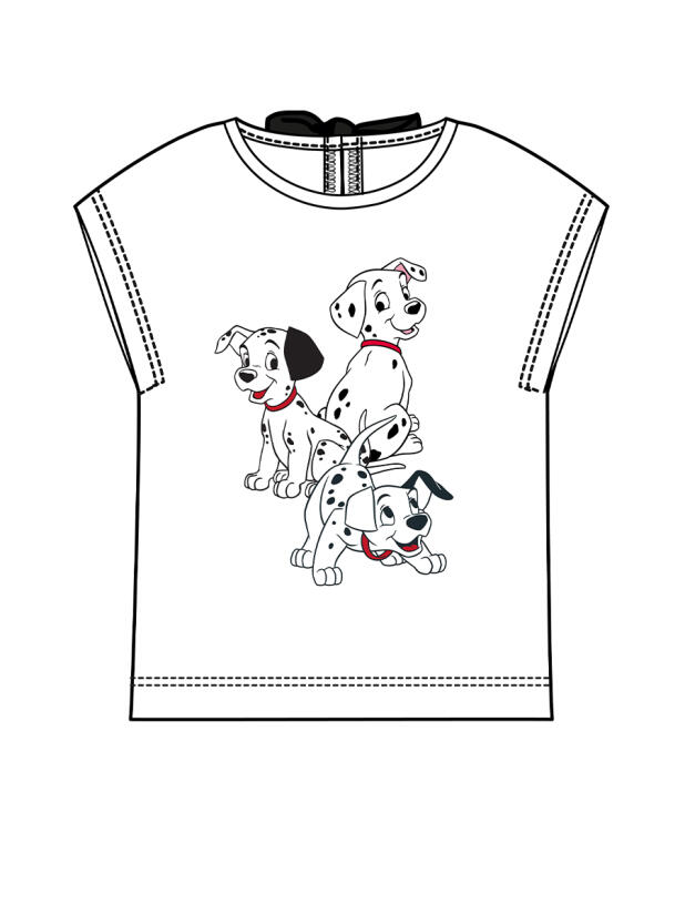 Детская футболка для девочки. Модель свободного кроя, выполнена из эластичного хлопкового трикотажа джерси. Спереди расположен крупный принт с героями из любимого мультфильма "101 далматинец". Горловина круглая. Сзади декорирована бантом.