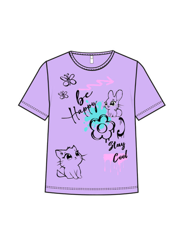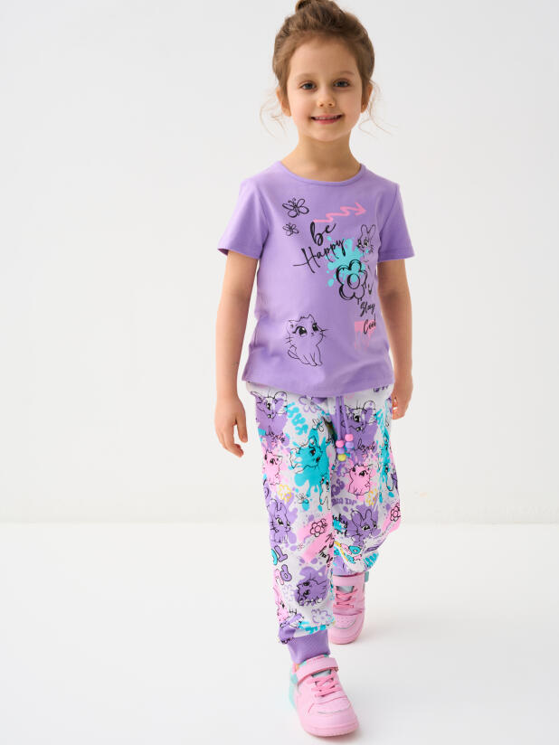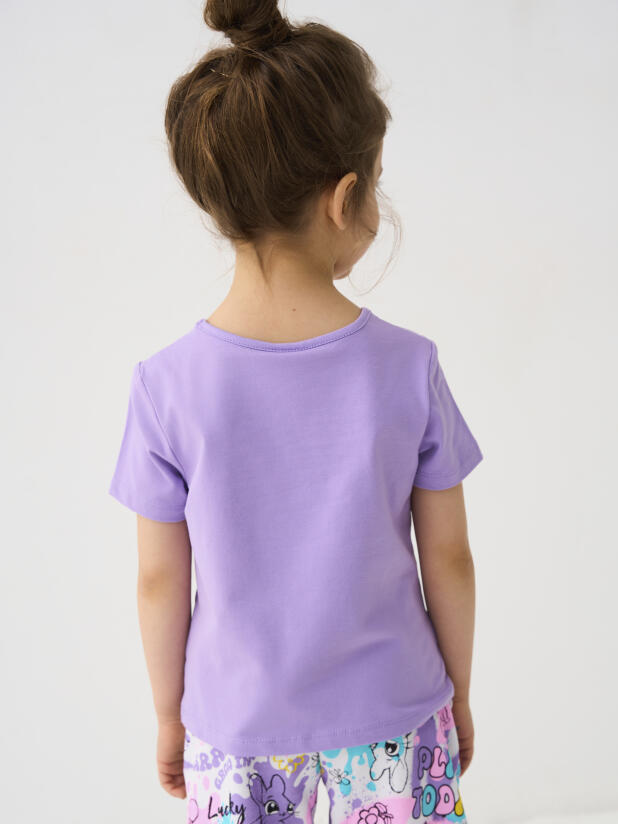 Детская футболка для девочки. Модель прямого кроя, выполнена из эластичного хлопкового трикотажа джерси. Спереди расположен крупный красочный принт. Горловина круглая.