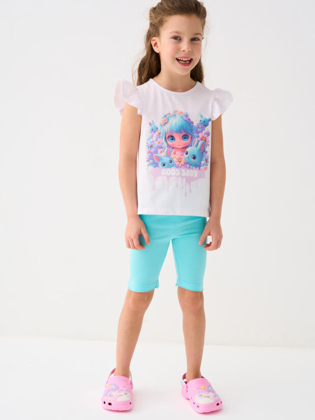 Детская футболка для девочки. Модель прямого кроя, выполнена из эластичного хлопкового трикотажа джерси. Спереди расположен крупный красочный принт. Горловина круглая. Рукава-крылышки.