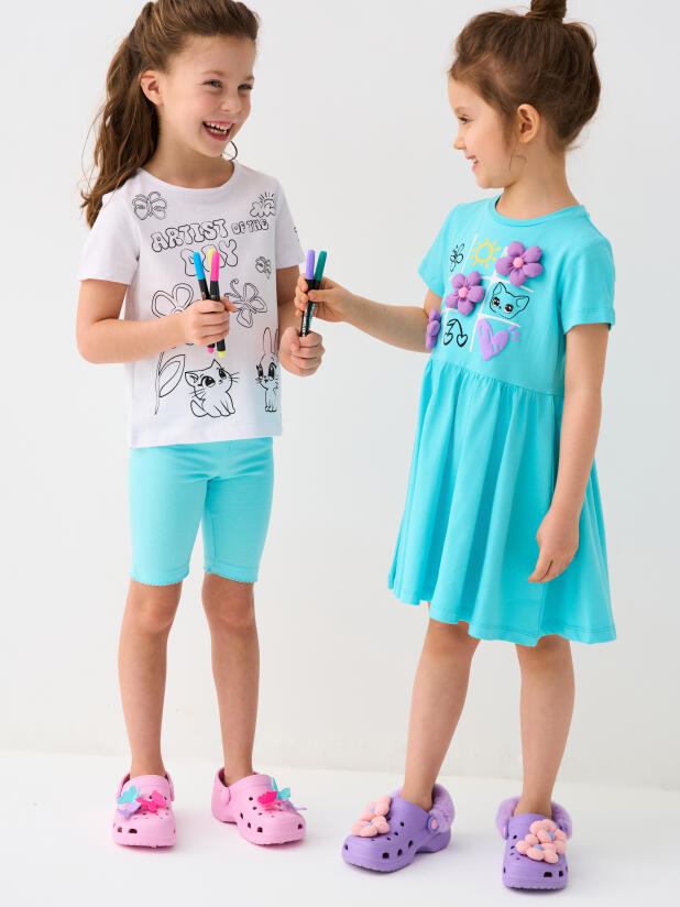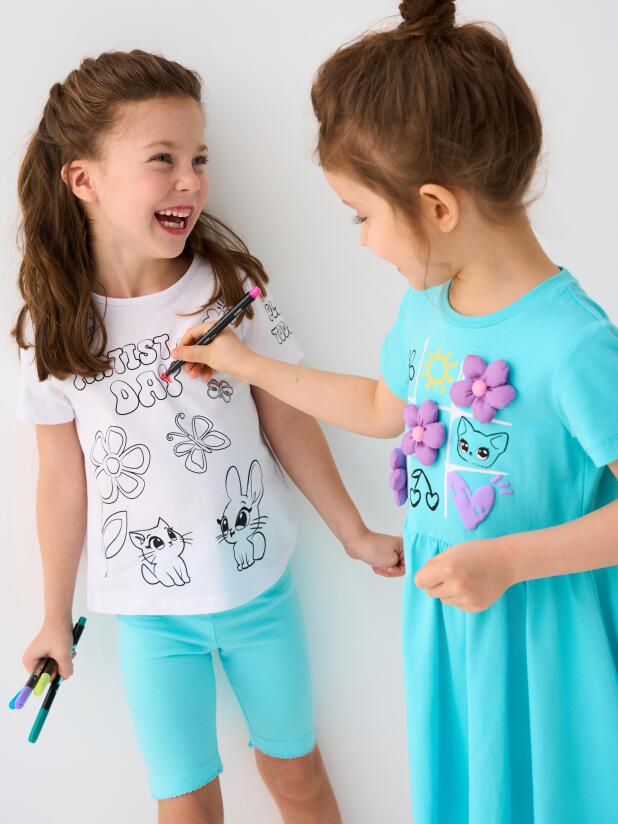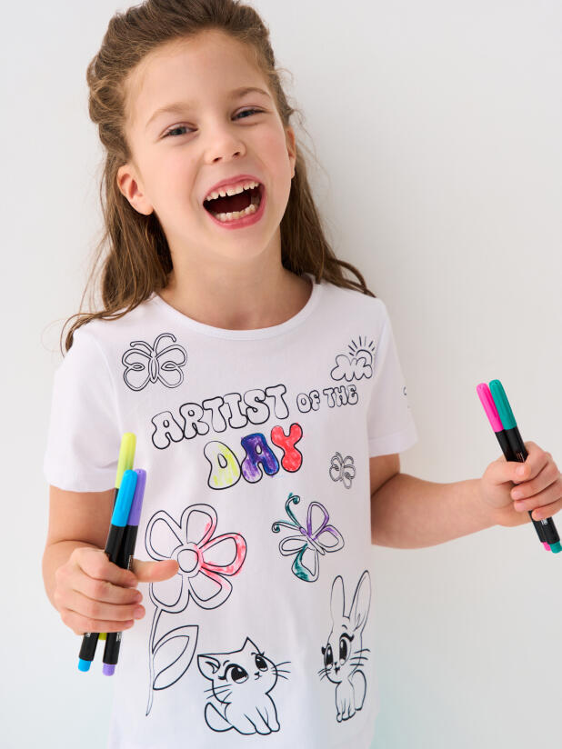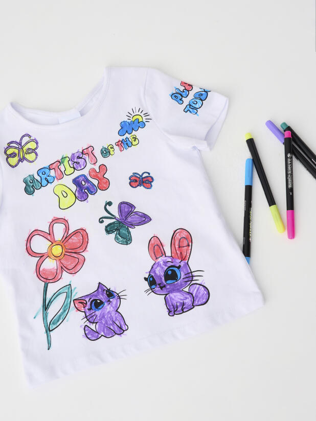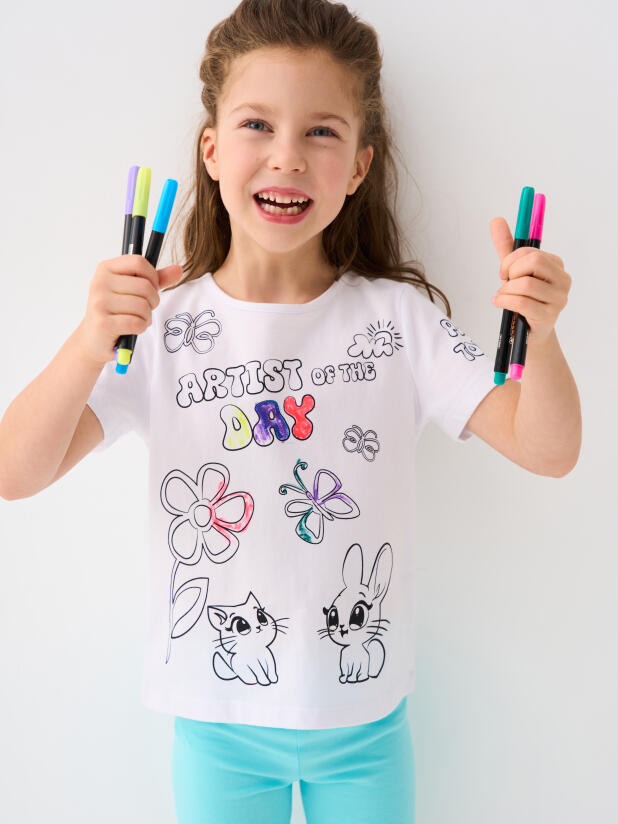 Детская футболка для девочки и набор фломастеров для рисования по ткани. Футболка прямого кроя, выполнена из мягкого хлопкового трикотажа белого цвета с принтом милых животных. В комплекте также идут фломастеры, которые позволят раскрасить футболку, создавая уникальный и персонализированный дизайн.