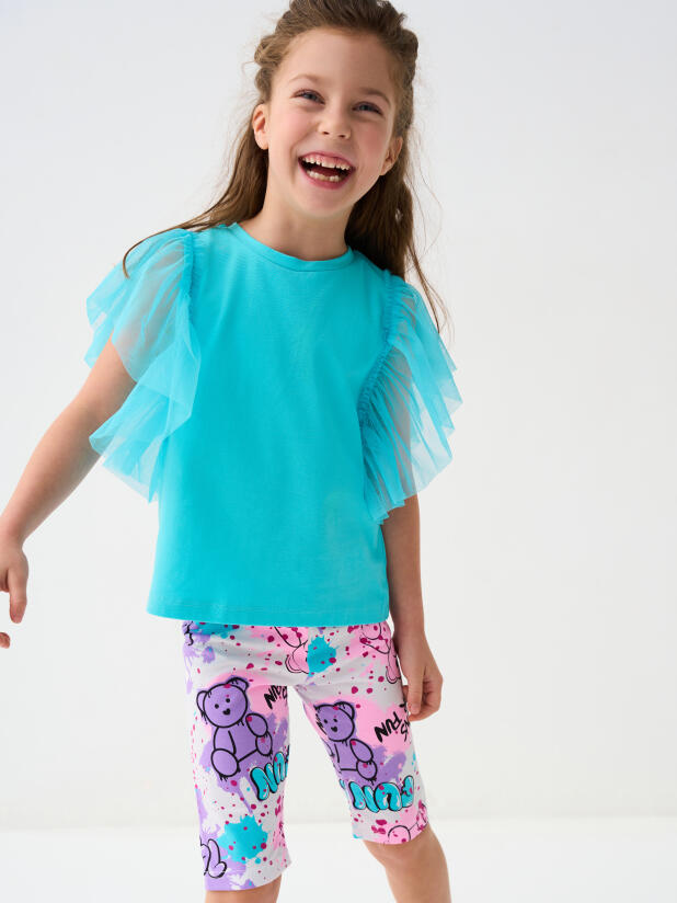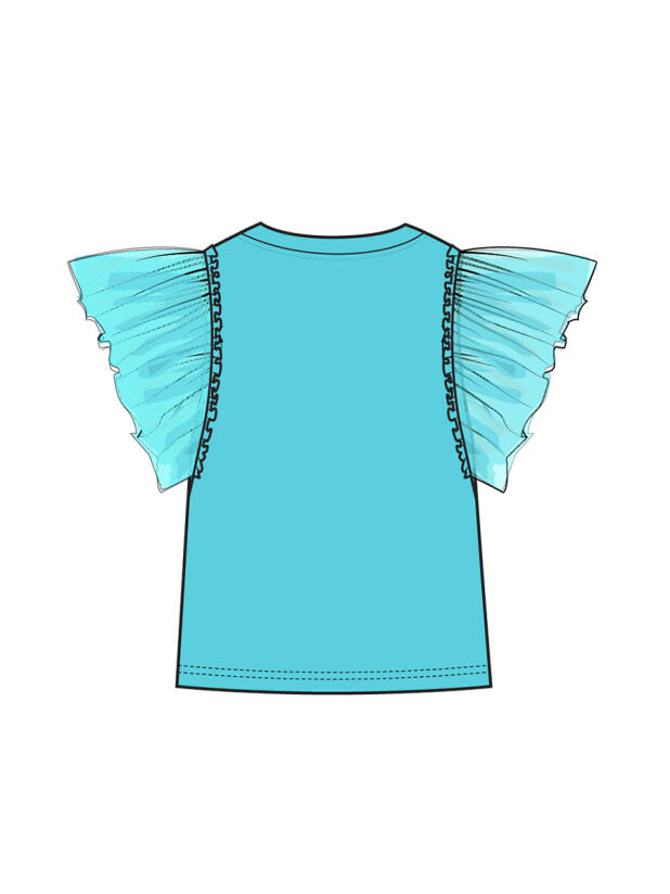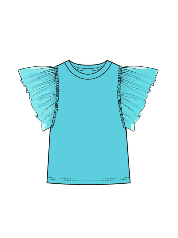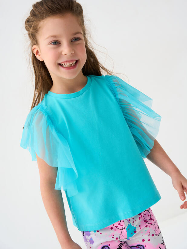 Детская футболка для девочки. Модель прямого кроя, выполнена из эластичного хлопкового трикотажа джерси. Горловина круглая. Рукава-крылышки из сетки.