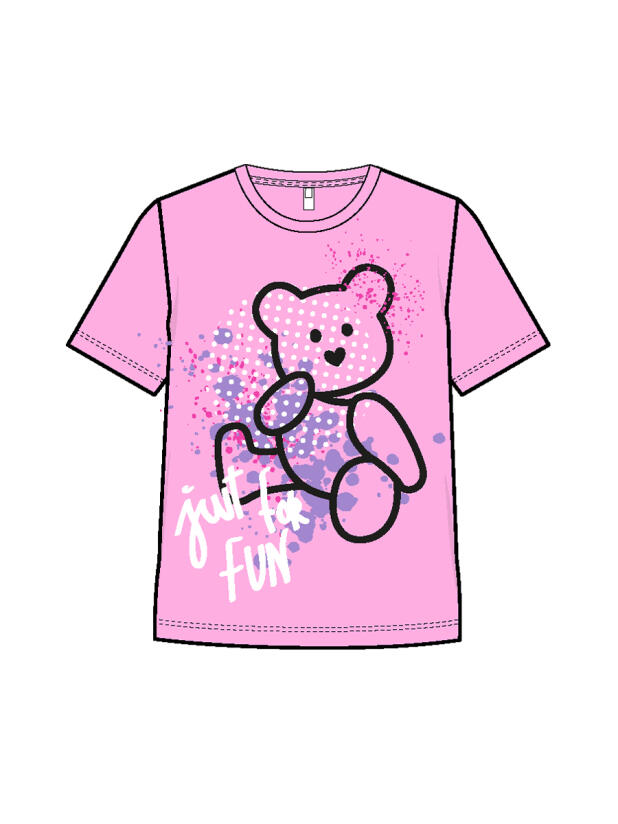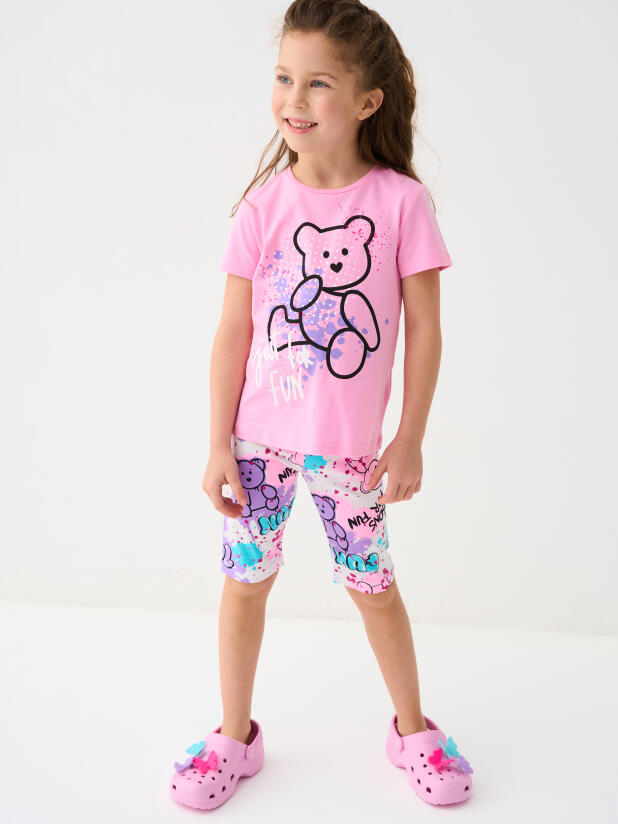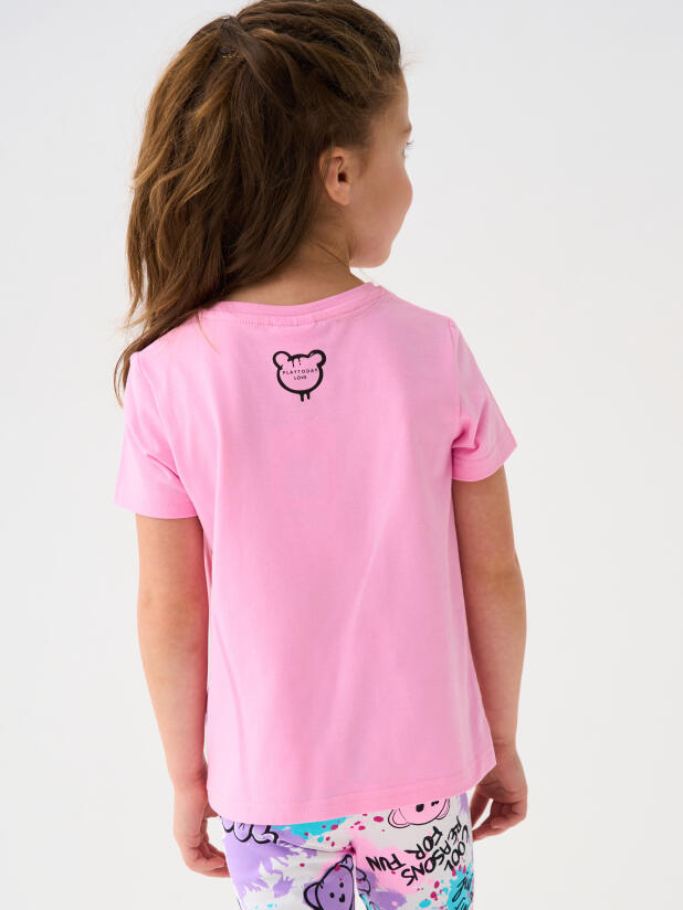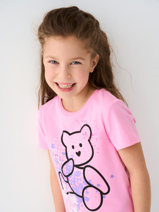 Детская футболка для девочки. Модель прямого кроя, выполнена из эластичного хлопкового трикотажа джерси. Красочный принт с милым мишкой. Горловина круглая.