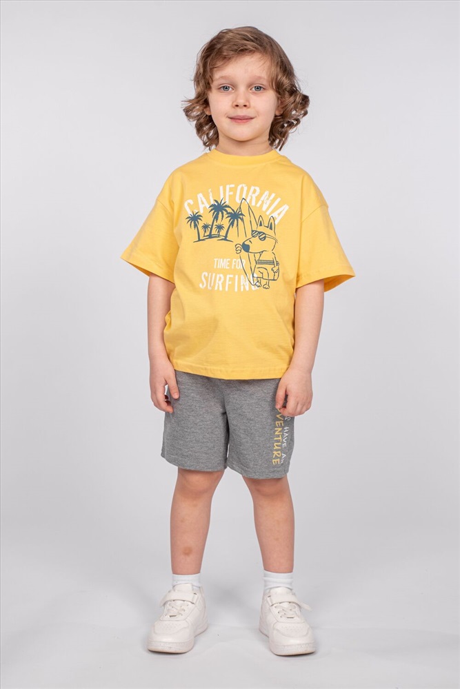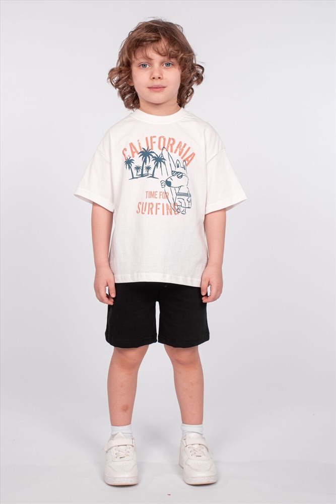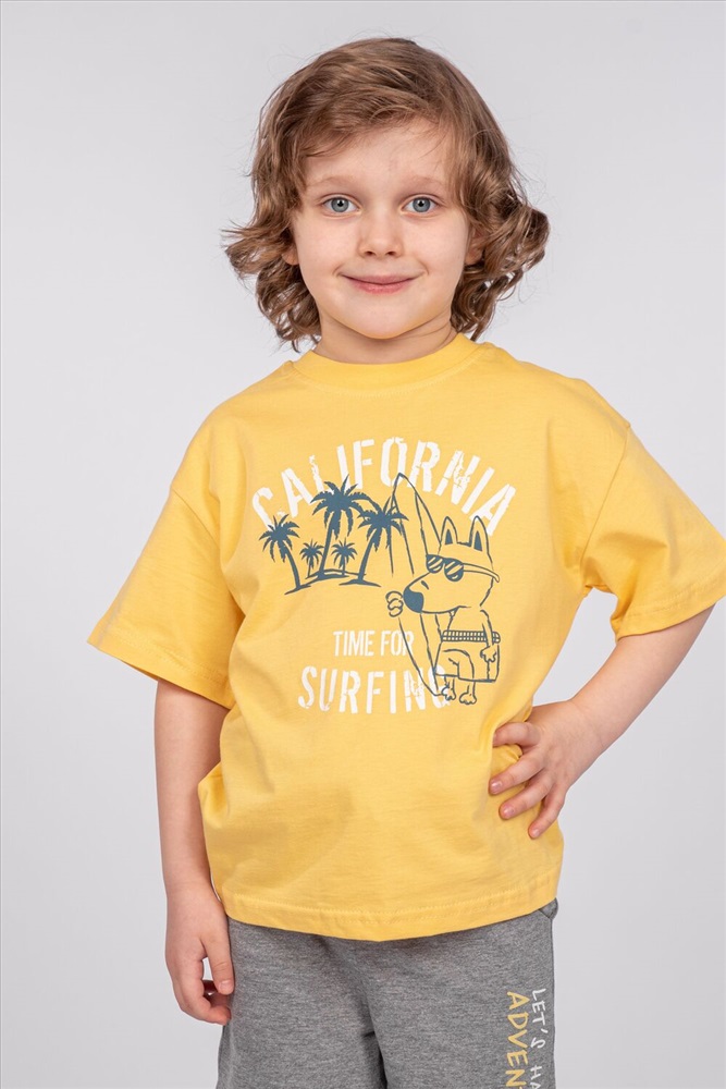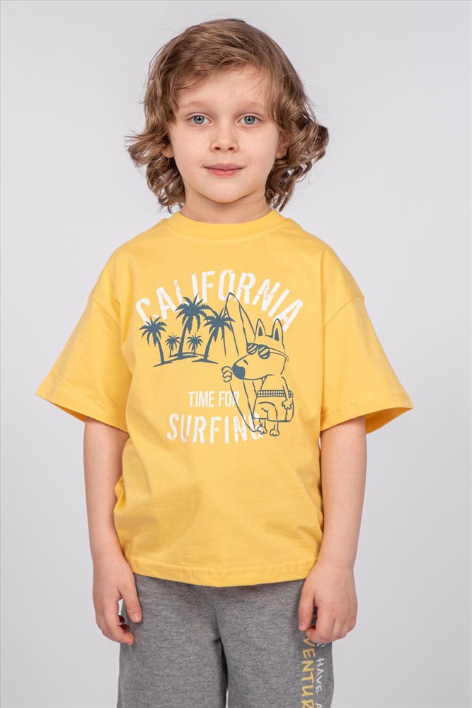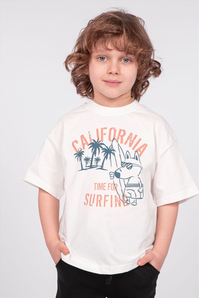 Стиль: повседневный Футболка для мальчика свободного силуэта (оверсайз) с коротким рукавом. Горловина круглая, обработана обтачкой горловиной из рибаны. Низ изделия и рукава обработаны швом вподгибку. На полочке принт Шелкография. Надпись преводится как Калифорния; Время для серфинга.