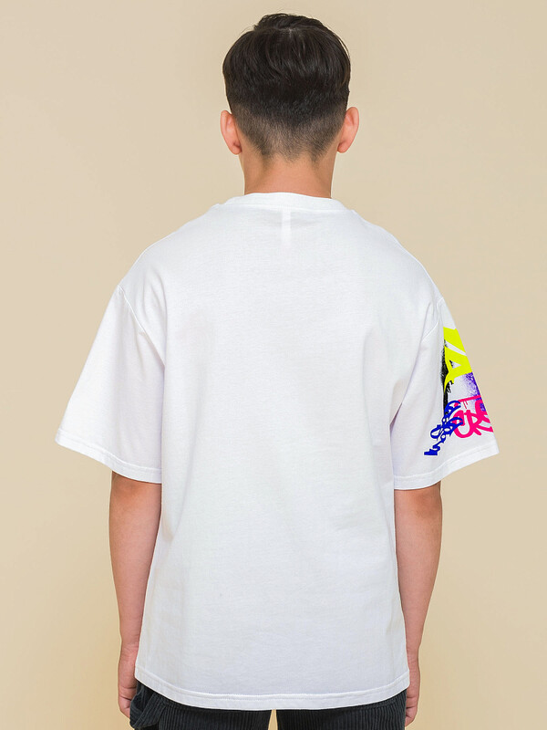 Детская футболка для мальчика. Комфортная майка свободного объёма не будет стеснять движений ребёнка. Джемпер с удлинёнными широкими рукавами — один из модных трендов сезона. Небольшой вырез горловины обработан широкой эластичной рибаной (ткань в рубчик) — она прекрасно держит форму, при этом ребёнку удобно надевать и снимать футболку. Изделие неприхотливо в уходе. Футболка с прикольным принтом в актуальном стиле граффити по переду и на левом рукаве. Надписи переводятся: «больше никакого скучного искусства», «извините, эта стена мне надоела, креативность», «приятный». Принты эластичные и прочные, не боятся частых стирок. В составе ткани 100% хлопка — майка мягкая, дышащая, приятная на ощупь. Футболка для мальчиков выполнена в белом цвете. Размерный ряд: 1 (86); 2 (92); 3 (98); 4 (104); 5 (110); 6 (116); 7 (122); 8 (128); 9 (134); 10 (140); 11 (146). Белая футболка оверсайз с принтом подходит как для маленьких мальчиков, так и для подростков. Её можно носить летом, осенью и весной (демисезон), зимой в качестве среднего слоя одежды. Подходит для детского сада, спорта, прогулок, отдыха, а также в качестве домашней одежды. Легко сочетается с различными брюками и шортами. Оверсайз-футболка для мальчика — отличный подарок сыну, внуку, брату или племяннику на любой праздник или просто в качестве знака внимания и заботы.
