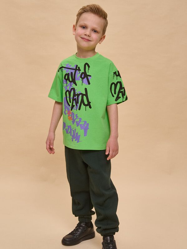 Яркая футболка для мальчиков. Комфортный джемпер оверсайз-силуэта не будет стеснять движений ребёнка. Майка с удлинёнными широкими рукавами — актуальный тренд сезона. Небольшой вырез горловины отделан широкой эластичной рибаной (ткань в рубчик) — она долго не теряет форму, при этом ребёнку удобно надевать и снимать футболку. За изделием легко ухаживать. Удлинённая футболка с принтом по переду и на левом рукаве выполнена из 100% качественного хлопка. Майка мягкая, отлично пропускает воздух, давая коже ребёнка дышать. Принты в актуальном стиле граффити эластичные и стойкие — прекрасно переносят многочисленные стирки. Надписи переводятся: «не в себе», «смешанные чувства». Футболка с надписями выполнена в модном желтом цвете. Размерная линейка: 1 (86); 2 (92); 3 (98); 4 (104); 5 (110); 6 (116); 7 (122); 8 (128); 9 (134); 10 (140); 11 (146). Футболка с прикольным принтом подходит как для маленьких мальчиков, так и для подростков. Идеальна для детского сада, спорта, прогулок, отдыха, а также в качестве домашней одежды. Подходит для носки летом, осенью и весной (демисезон), зимой в качестве среднего слоя одежды. Её просто комбинировать с разнообразными брюками и шортами. Оверсайз-футболка для мальчика — замечательный подарок сыну, внуку, племяннику или брату на День рождения и любой другой праздник.