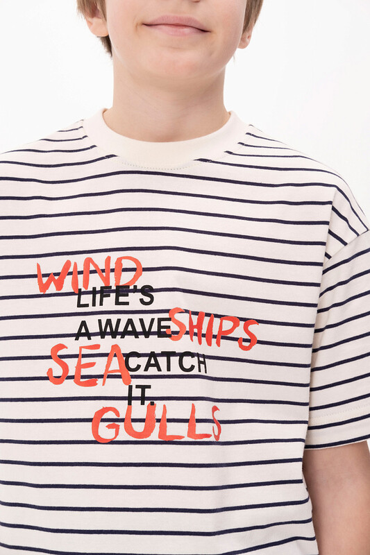 Футболка для мальчика свободного кроя  - это идеальный выбор для активного ребенка. Вырез горловины обработан эластичной тканью — она прекрасно держит форму, не растягивается, при этом ребёнку удобно надевать и снимать футболку.По переду принт с надписями. Перевод принта "wind, ships, sea, gulls" - ветер, корабли, море, чайки, "life's a wave catch it" - жизнь это волна, ловите ее. Спортивная футболка подходит как для малышей в детский сад так и для подростков. Она подходит для любого времени года, её можно носить как летом, так и в холодное время года в качестве среднего слоя одежды. Помните о правильном уходе за изделием: рекомендуется стирать при температуре не выше 30 °C, без предварительного замачивания, с изнанки. Это поможет сохранить качество и цвет футболки на длительное время.