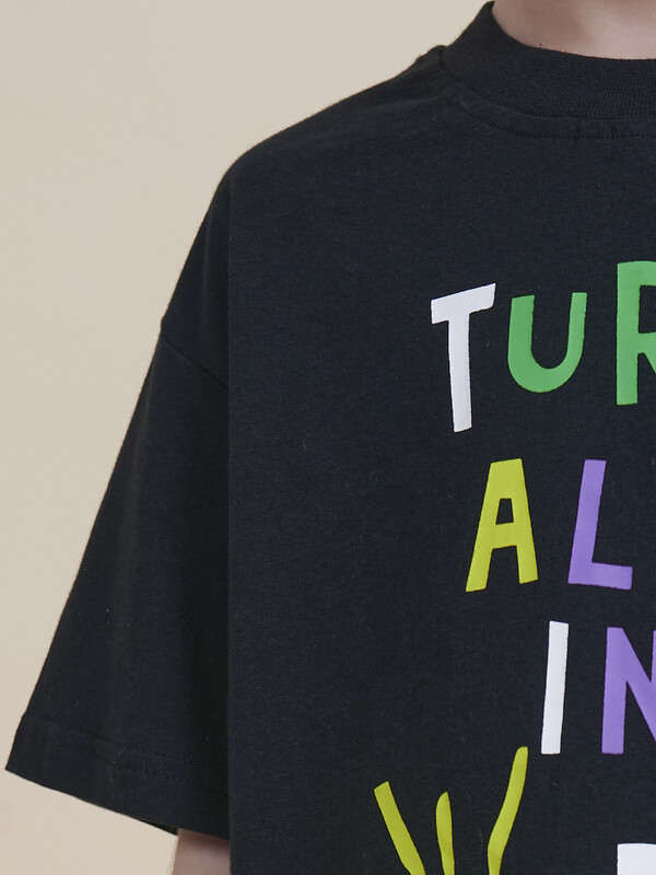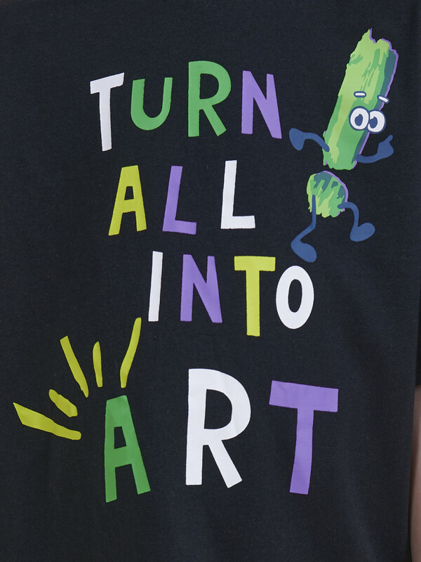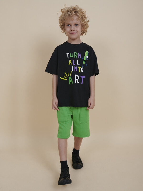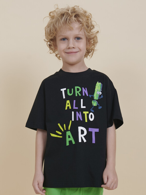 Изделие сшито из 100% натурального хлопка, мягкий материал приятно прилегает к телу, не вызывая дискомфортных ощущений во время движений. Хлопок хорошо пропускает воздух, обеспечивает гигроскопичность. Материал не задерживает влагу - ребенок не потеет. Футболка с оптимальным размером горловины удобна в носке - позволит ребенку с легкостью надевать и снимать ее самостоятельно, прослужит долго и будет радовать износостойкостью. Модель представлена в черном цвете. Черная футболка для мальчика - оптимальный вариант на любой выход. Футболка для мальчика с принтом украшена надписью "Turn all into art" – перевод "Превратим всё в искусство". Изделие привлекает интересным дизайном. Свободная футболка для мальчика подростковая рассчитана на возраст садика и школы. Размерная линейка: 1 (86); 2 (92); 3 (98); 4 (104); 5 (110); 6 (116); 7 (122); 8 (128); 9 (134); 10 (140); 11 (146). Крутая футболка для мальчика – отличный подарок для сына, внука, братика, племянника, крестника! Выбирайте нужный размер по таблице размеров на фото. Цвет товара на экране вашего устройства может отличаться от цвета изделия вживую. Состав: 100%хлопок Комментарии к товару