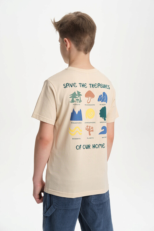Состав: 100%хлопок Футболка для мальчика свободного кроя - это идеальный выбор для активного ребенка. Вырез горловины обработан эластичной тканью — она прекрасно держит форму, не растягивается, при этом ребёнку удобно надевать и снимать футболку. Футболка летняя с принтом на спине и надписями. Перевод надписей "save the treasures of our home" - сохрани сокровища нашего дома, "forests, mushrooms, minerals, mountains, atmoshpere, greenery, deserts, plants, water" - леса, грибы, минералы, атмосфера, зелень, пустыни, растения, воду. Спортивная футболка подходит как для подростков так и для малышей в детский сад. Подходит для любого времени года. Комментарии к товару