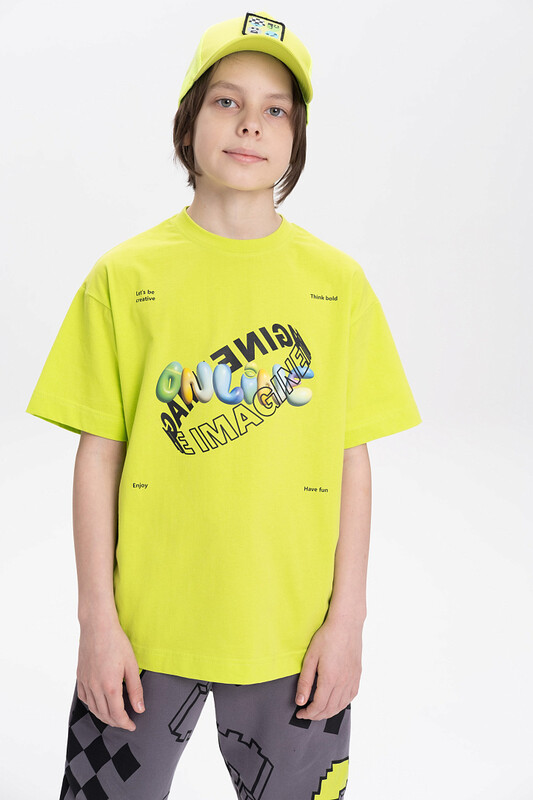 Футболка для мальчика свободного кроя - это идеальный выбор для активного ребенка. Вырез горловины обработан эластичной тканью — она прекрасно держит форму, не растягивается, при этом ребёнку удобно надевать и снимать футболку. Изделие неприхотливо в уходе. Футболка летняя с принтом и надписями в стиле Digital. Перевод надписей: "let's be creative" - будь креативный,  "think bold" - думай смелее, "enjoy" - наслаждайся, "have fun" - веселись.Яркая спортивная футболка подходит как для подростков так и для малышей в детский сад. Подходит для любого времени года.
