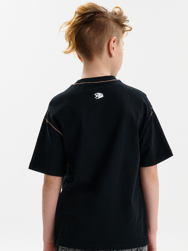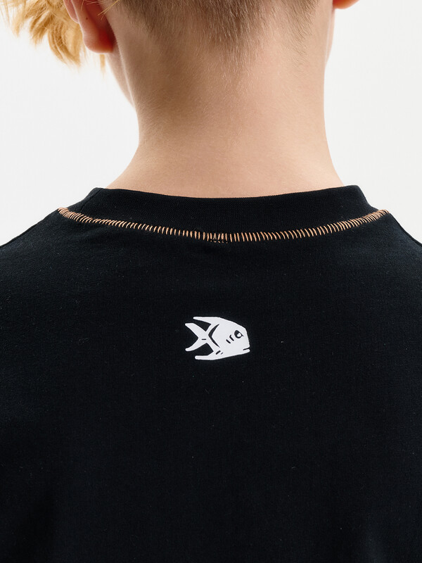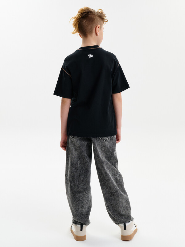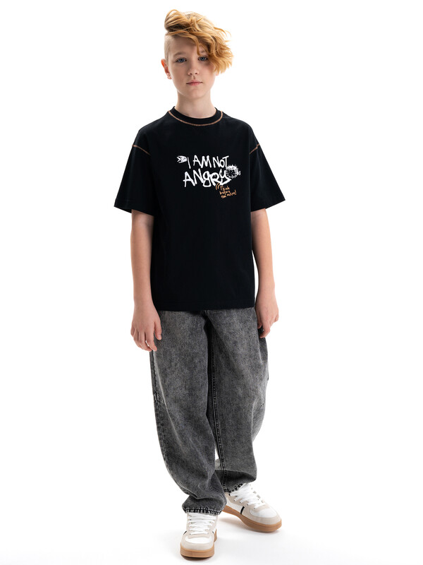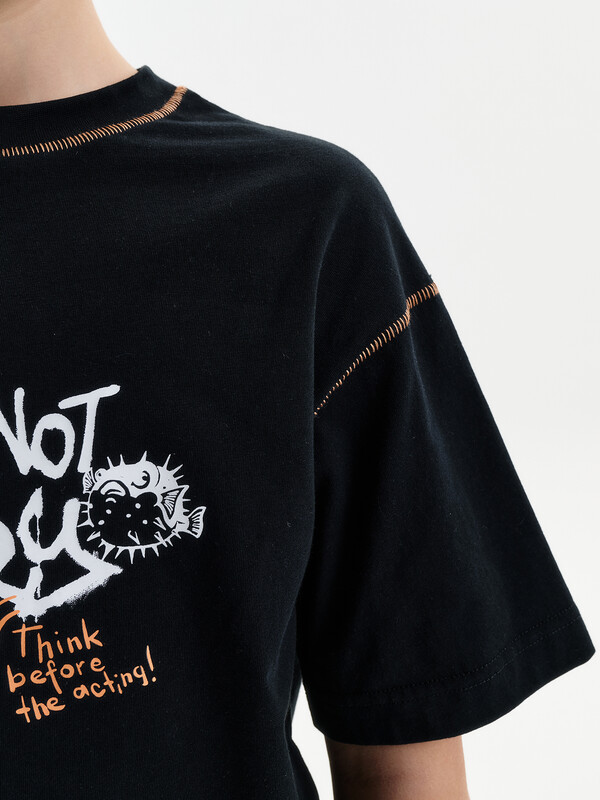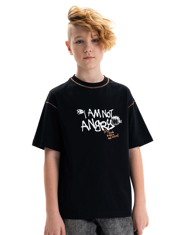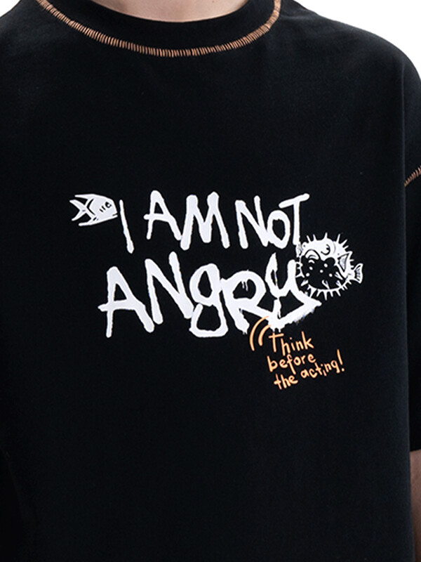 Футболка среднего объема из хлопка 100%. По низу рукава и низу изделия широкая подгибка. По шву притачивания горловины и рукава декоративная строчка. Вырез горловины обработан эластичной рибаной (ткань в рубчик) — она отлично держит форму, не растягивается, при этом ребёнку удобно надевать и снимать футболку. Перевод: я не сержусь. ((Думай, прежде чем действовать!