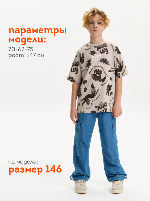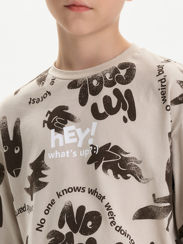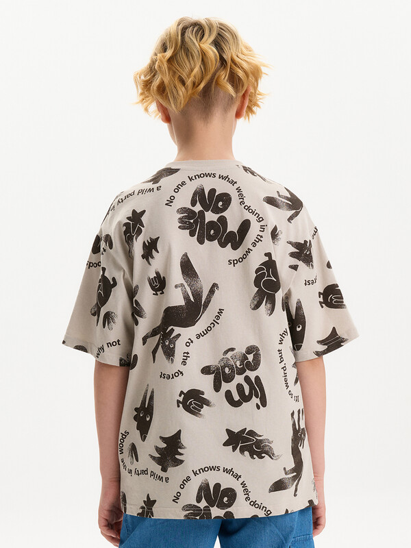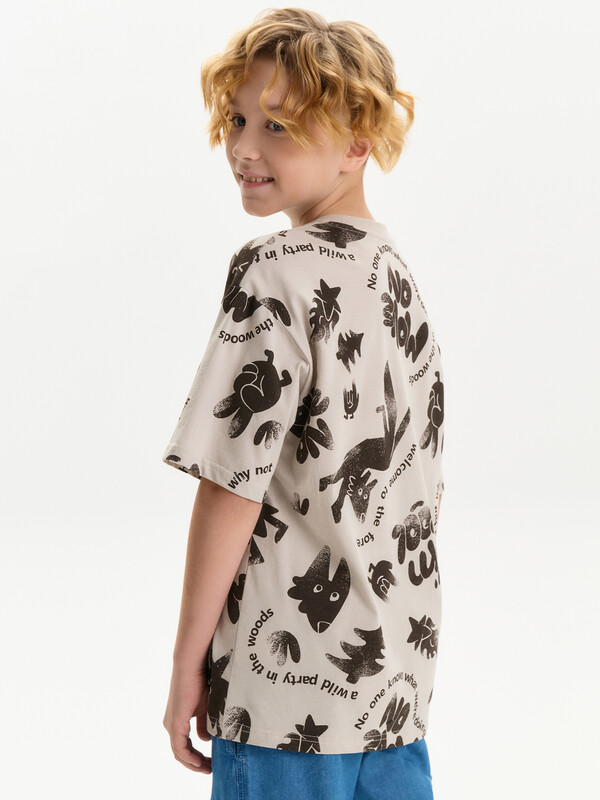 Состав: 100%хлопок Футболка для мальчика. Комфортная, умеренного оверсайз-объёма со спущенным плечом. Вырез горловины обработан эластичной рибаной (ткань в рубчик) — она отлично держит форму, не растягивается, при этом ребёнку удобно надевать и снимать футболку. Перевод: Эй! как дела?:) Дикая вечеринка в лесу; Никто не знает, что мы делаем в лесу; Это так странно, но почему бы и нет; Добро пожаловать в лес. Комментарии к товару