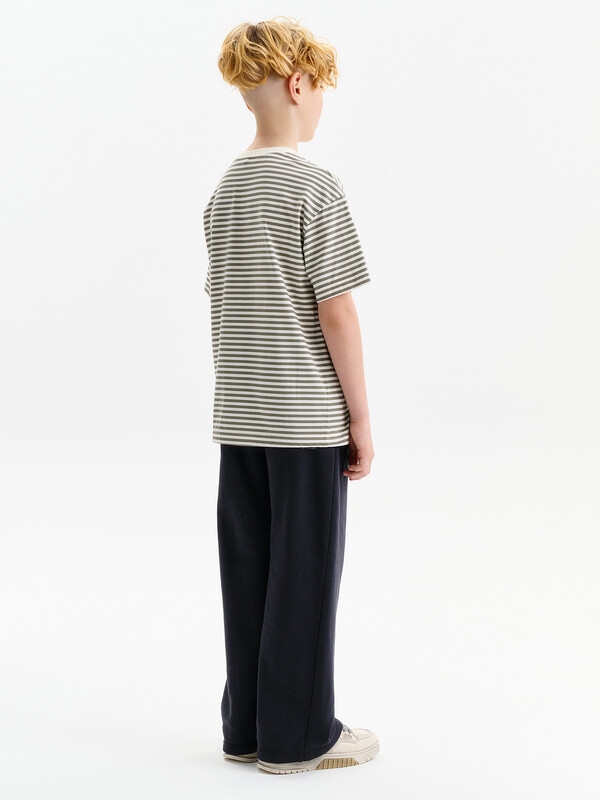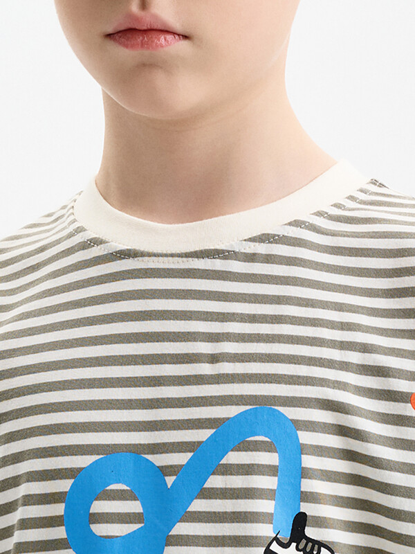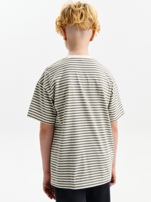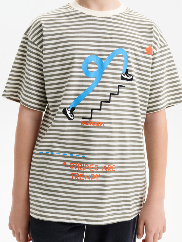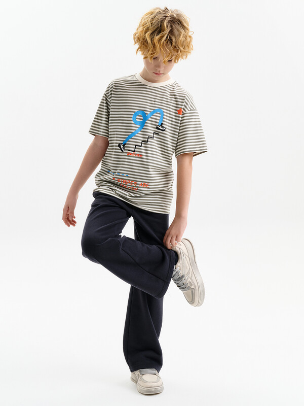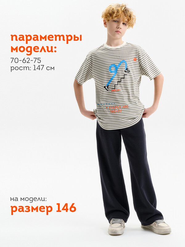 Состав: 100%хлопок Футболка для мальчика прямого кроя умеренного объема. Уменьшена длина по сравнению с футболками Осень 25. Вырез горловины обработан эластичной рибаной — она прекрасно держит форму, не растягивается, при этом ребёнку удобно надевать и снимать футболку. Футболка с принтом и надписями. Перевод: полоски в тренде. Комментарии к товару