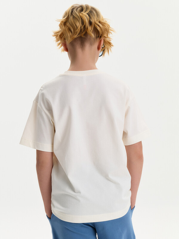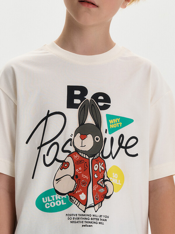 Футболка для мальчика прямого кроя умеренного объема. Уменьшена длина по сравнению с футболками Осень 25. Вырез горловины обработан эластичной рибаной — она прекрасно держит форму, не растягивается, при этом ребёнку удобно надевать и снимать футболку. Футболка с принтом и надписями. Перевод: Будь позитивным почему бы и нет?; Так чилово; Ультра круто; Позитивное мышление позволит тебе сделать все лучше, чем негативное мышление.