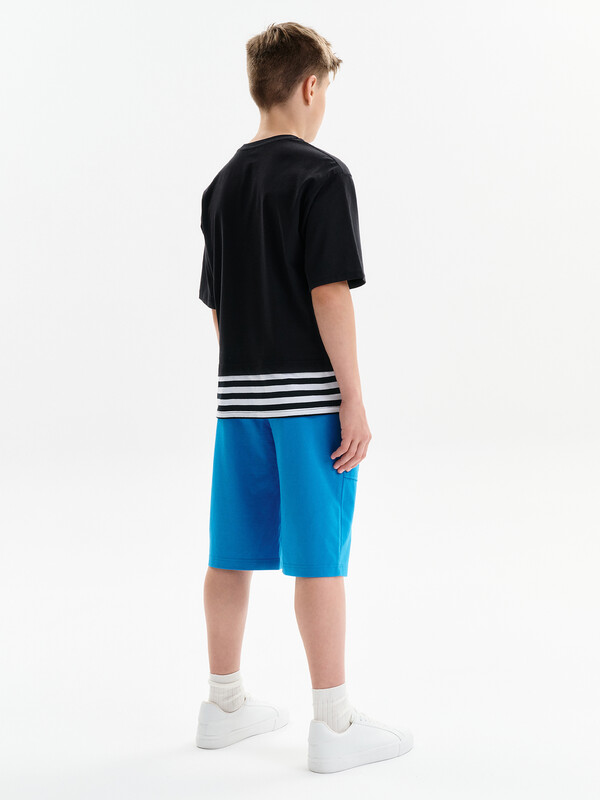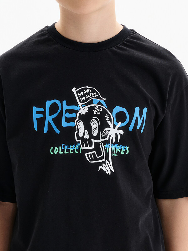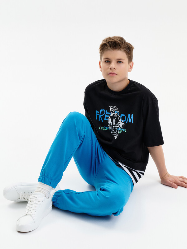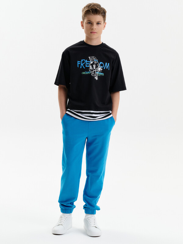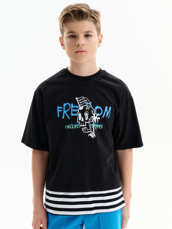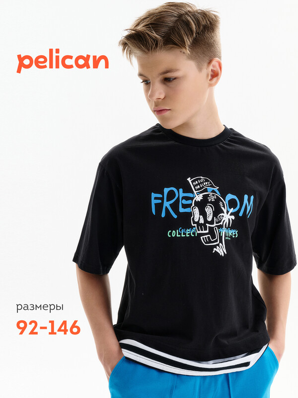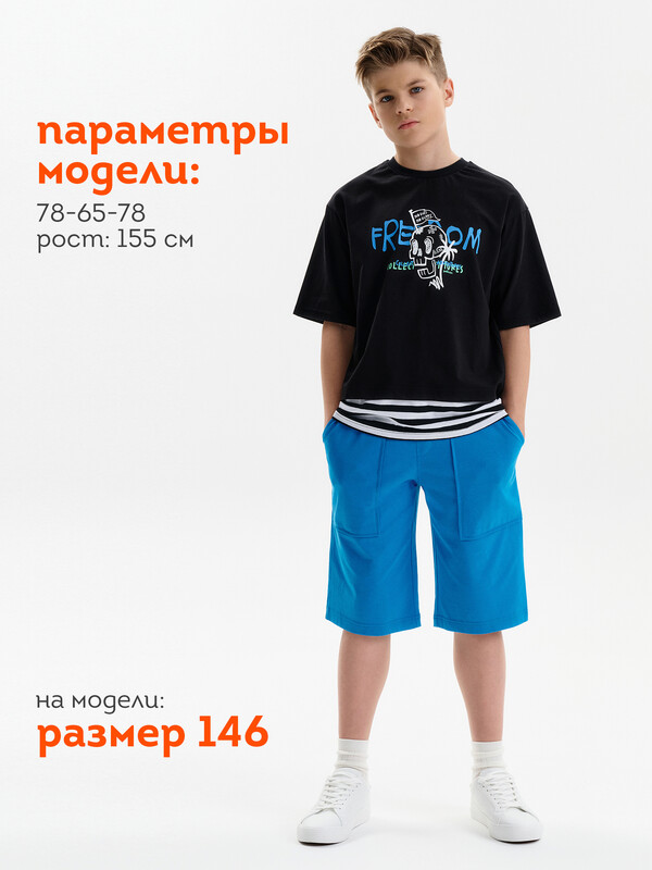 Состав: 100%хлопок Футболка для мальчика. Комфортная, умеренного оверсайз-объёма со спущенным плечом. Вырез горловины обработан эластичной рибаной (ткань в рубчик) — она отлично держит форму, не растягивается, при этом ребёнку удобно надевать и снимать футболку. Футболка с иммитацией многослойности за счет вставок по низу переда и спинки из материала в полоску. Перевод: Нет смелости — нет славы; Свобода; Коллекционируй приключения; Настоящий. Комментарии к товару