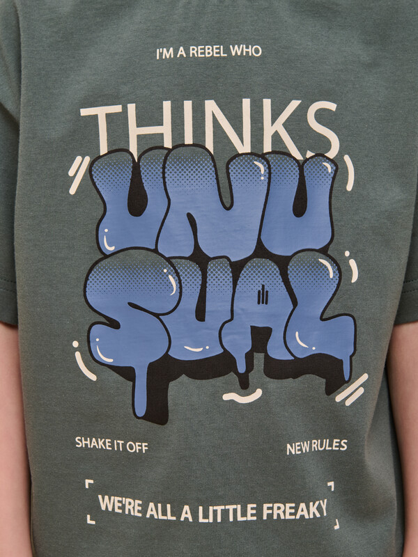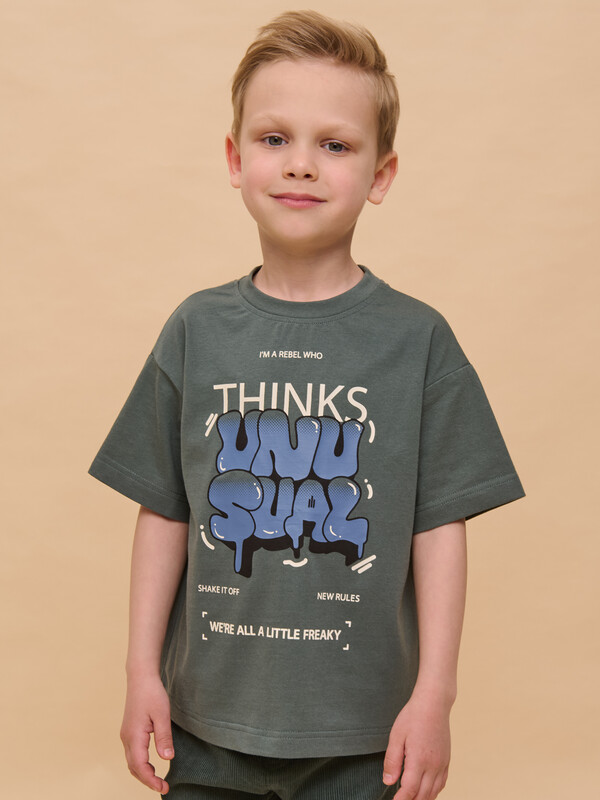 Детская футболка для мальчика. Комфортная майка умеренного оверсайз-объёма со спущенным плечом подарит ребёнку свободу движений. Вырез горловины обработан эластичной рибаной (ткань в рубчик) — она отлично держит форму, не растягивается, при этом ребёнку удобно надевать и снимать футболку. Изделие неприхотливо в уходе. Футболка детская с принтом в актуальном готическом стиле. Надписи переводятся: «я бунтарь, который мыслит необычно», «взбодрись, новые правила», «все мы немного странные». Принт эластичный и устойчивый, хорошо переносит многочисленные стирки. В составе ткани 100% хлопка — майка мягкая, воздухопроницаемая, приятная на ощупь. Футболка для мальчиков выполнена в универсальной расцветке, её легко сочетать с различными брюками, джинсами. Детские футболки с принтом подходят как для маленьких мальчиков, так и для подростков. Оверсайз-футболка для мальчика подходит для любого времени года, её можно носить как летом, так и в холодное время года в качестве среднего слоя одежды. Помните о правильном уходе за изделием: рекомендуется стирать при температуре не выше 30 °C, без предварительного замачивания, с изнанки. Это поможет сохранить качество и цвет футболки на длительное время.