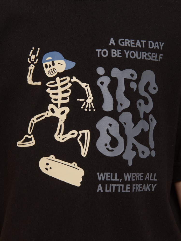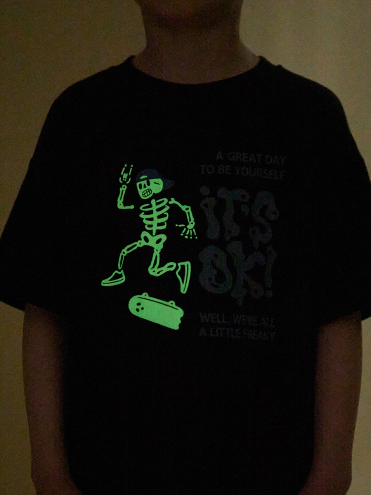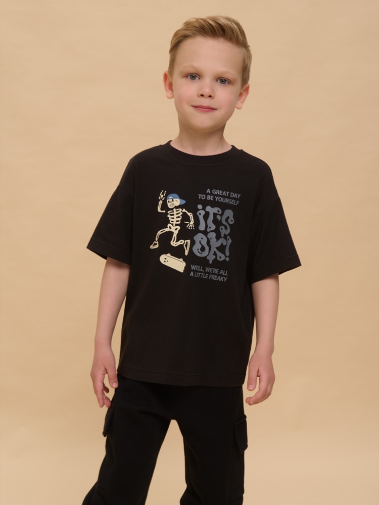 Детская футболка для мальчика. Комфортная майка умеренного оверсайз-объёма со спущенным плечом подарит ребёнку свободу движений. Вырез горловины обработан эластичной рибаной (ткань в рубчик) — она отлично держит форму, не растягивается, при этом ребёнку удобно надевать и снимать футболку. Изделие неприхотливо в уходе. Футболка детская с принтом в актуальном готическом стиле. Надписи переводятся: «хороший день, чтобы быть собой», «всё окей!», «все мы немного странные». Принт эластичный и устойчивый, хорошо переносит многочисленные стирки. Фишка модели — принт светится в темноте! Это не оставит равнодушным ни одного ребёнка! В составе ткани 100% хлопка — майка мягкая, воздухопроницаемая, приятная на ощупь. Футболка для мальчиков выполнена в универсальной расцветке, её легко сочетать с различными брюками, джинсами. Детские футболки с принтом подходят как для маленьких мальчиков, так и для подростков. Оверсайз-футболка для мальчика подходит для любого времени года, её можно носить как летом, так и в холодное время года в качестве среднего слоя одежды. Помните о правильном уходе за изделием: рекомендуется стирать при температуре не выше 30 °C, без предварительного замачивания, с изнанки. Это поможет сохранить качество и цвет футболки на длительное время. Не забывайте о выборе правильного размера. Используйте таблицу размеров на фотографии, чтобы выбрать подходящий вариант для вашего мальчика. Обратите внимание, что цвет товара на экране вашего устройства может отличаться от реального. Состав: 100%хлопок Возрастная группа: Kids Сезон: Осень Год: 2024 Пол: Мальчики