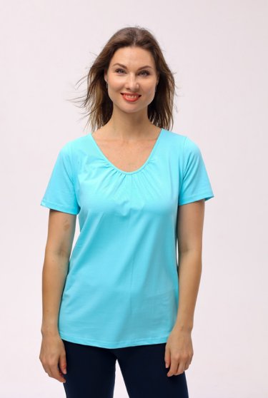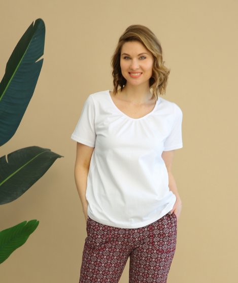 Производитель: Глория трикотаж Оптовая продажа. Футболка женская полуприлегающего силуэта с короткими рукавами, на горловине сборка. Состав: Хлопок: 95% Эластан: 5%