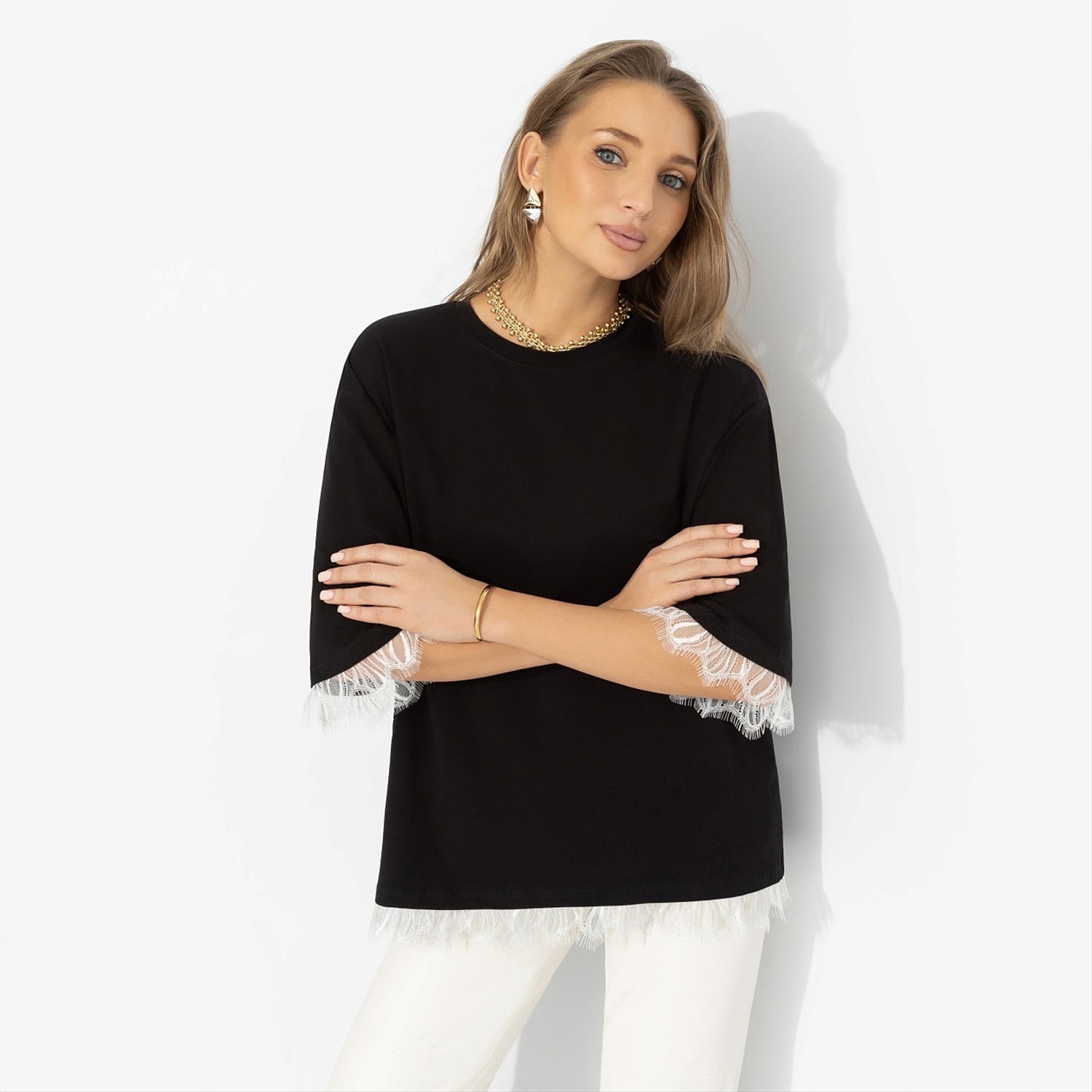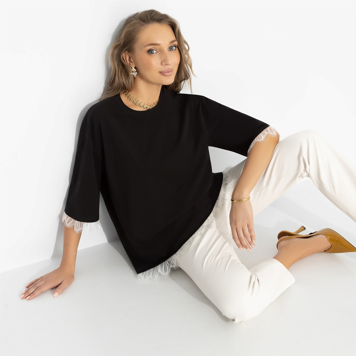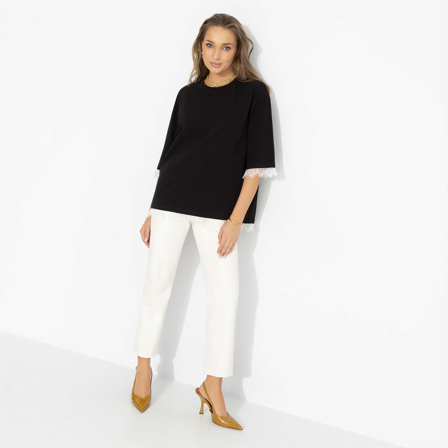В ней было что-то из «Грозового перевала» – драма в воздухе и чувственность во взгляде. И немного от Марго Робби вне съёмочной площадки: естественная, уверенная, без лишних эффектов. Свободный крой футболки ЧАРУТТИ мягко спадает по фигуре, удлинённый рукав с кружевной отделкой добавляет тонкий романтический акцент. Чёрный цвет усиливает глубину, а посадка остаётся расслабленной. Комплименты начнутся раньше, чем приветствие.