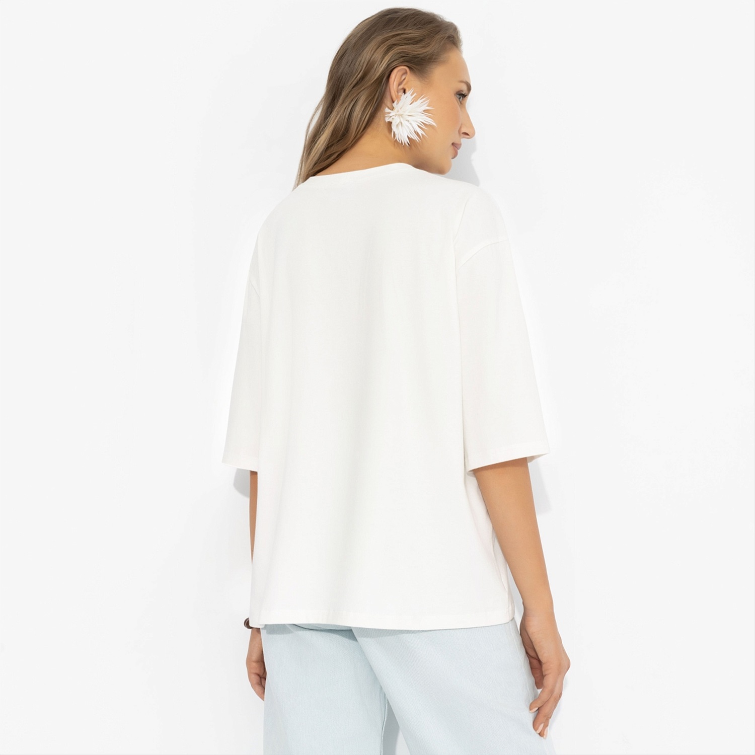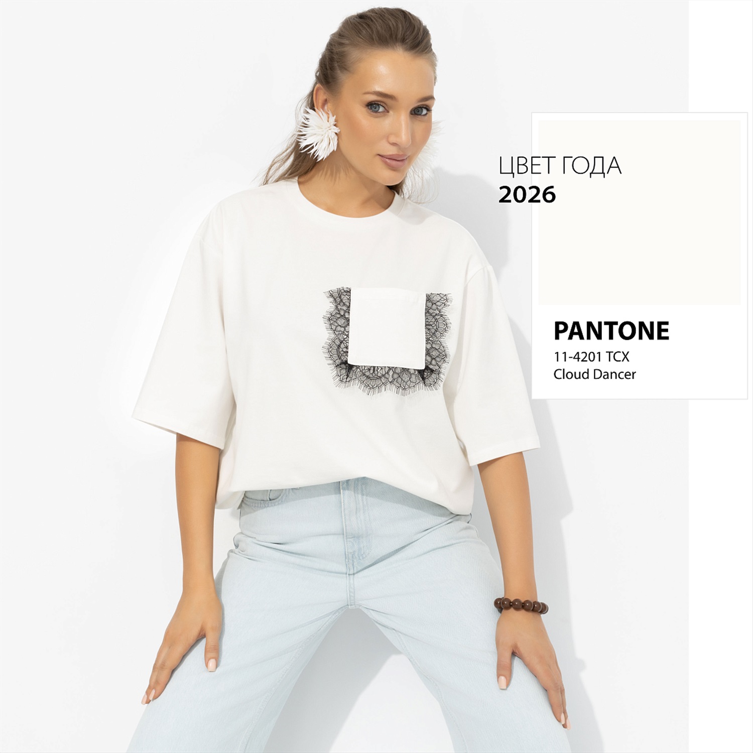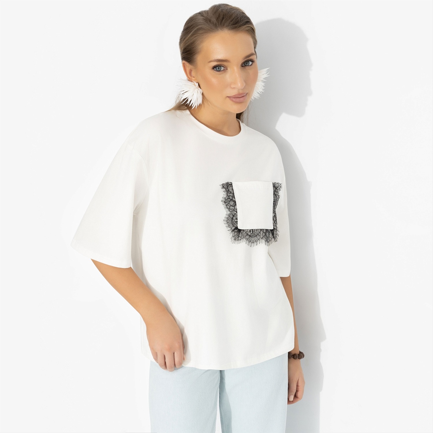 Весна требует лёгкости – и эта футболка даёт ее сполна. Белый цвет работает как свежий воздух в наскучившем за зиму гардеробе, а контрастная кружевная вставка добавляет модный штрих romantic core. Свободный крой, спущенная линия плеча и удлинённый рукав создают расслабленный силуэт, который легко стилизовать с денимом или строгими брюками. Чисто, свежо, с характером – база, которая играет в твою пользу.
