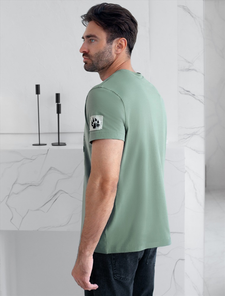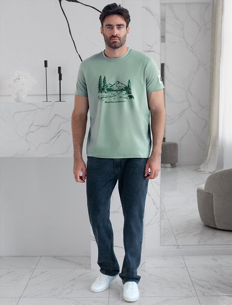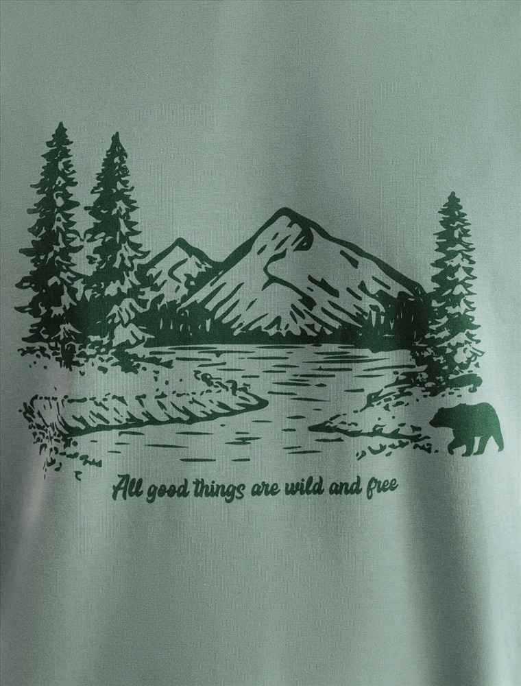 Перевод принта: All good things are wild and free - все лучшее ждет в диких местах. Футболка выполнена из премиального хлопка с эластаном. Авторский принт нанесен фактурными красками с устойчивым покрытием. Изделие комфортно сидит по фигуре, не сковывая движений. За счет среднего объема, хорошо подойдет как первый слой под пиджак, кардиган или бомбер. На рукаве нашивка из эко-кожи с логотипом бренда.