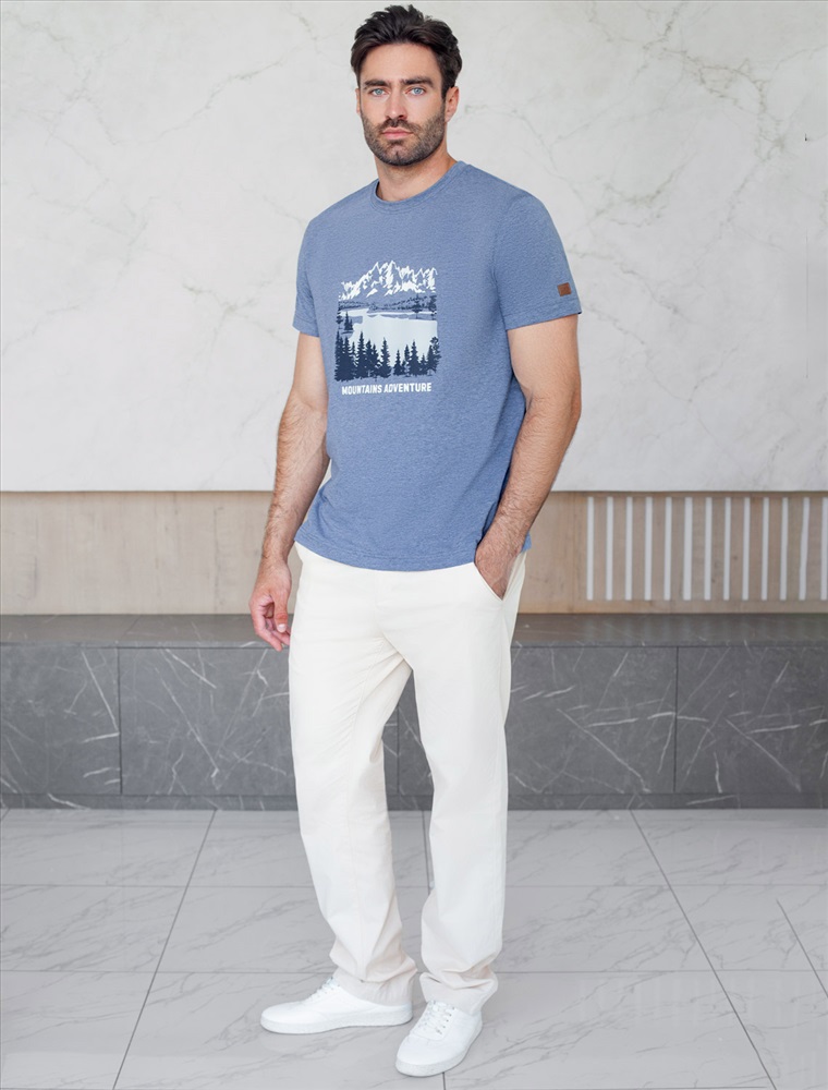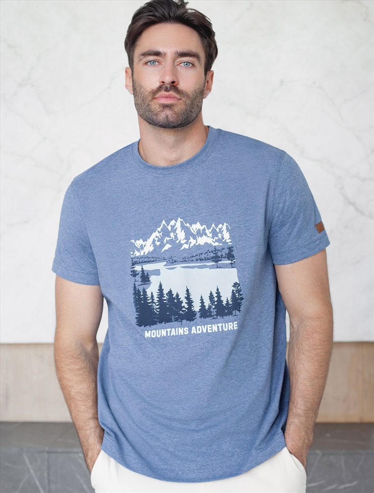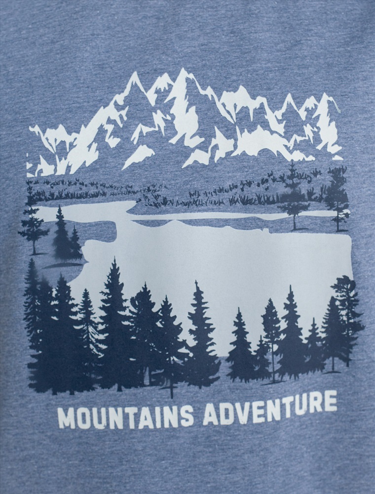 Перевод принта: Mountains adventure - приключение в горах. Футболка выполнена из премиального хлопка с эластаном. Авторский принт нанесен фактурными красками с устойчивым покрытием. Изделие комфортно сидит по фигуре, не сковывая движений. За счет среднего объема, хорошо подойдет как первый слой под пиджак, кардиган или бомбер. На рукаве нашивка из эко-кожи с логотипом бренда.