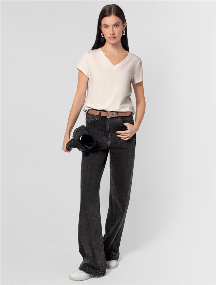 Однотонная футболка с V-образным вырезом выполнена из премиального хлопка. Добавление эластана в состав изделия способствует формоустойчивости. Самое высокое качество длинноволокнистых хлопковых волокон обеспечивает комфорт в любое время года. Совет стилиста: очищенная от декора базовая модель будет уместна не только в повседневном образе с денимом, но и в офисе с нестрогим дресс-кодом, в паре с брюками и жакетом.