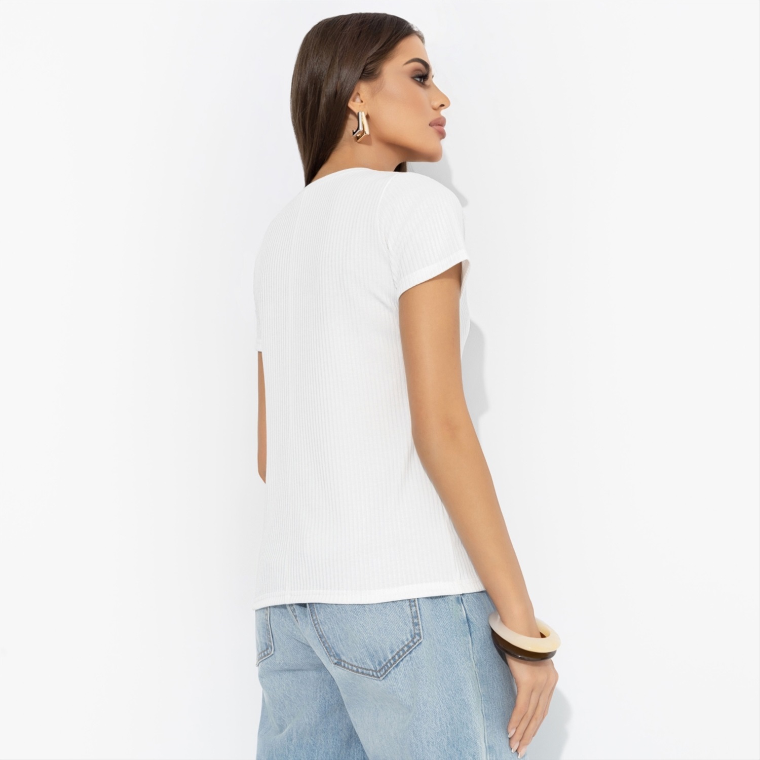 ТН ВЭД: 6109909000; Состав: «Трикотаж лапша» (65% п/э, 30% вискоза, 5% спандекс); Плотность ткани: Средняя; Тип ткани: Трикотаж; Вид застежки: Нет; Карманы: Нет; Основной цвет ткани: Белый; Отрезная талия: Нет; Подклад: Нет; Резинка по талии: Нет; Рисунок/раппорт: Нет, все изделия идентичны; Сезон: Лето; Силуэт: Приталенный; Стиль: Повседневный