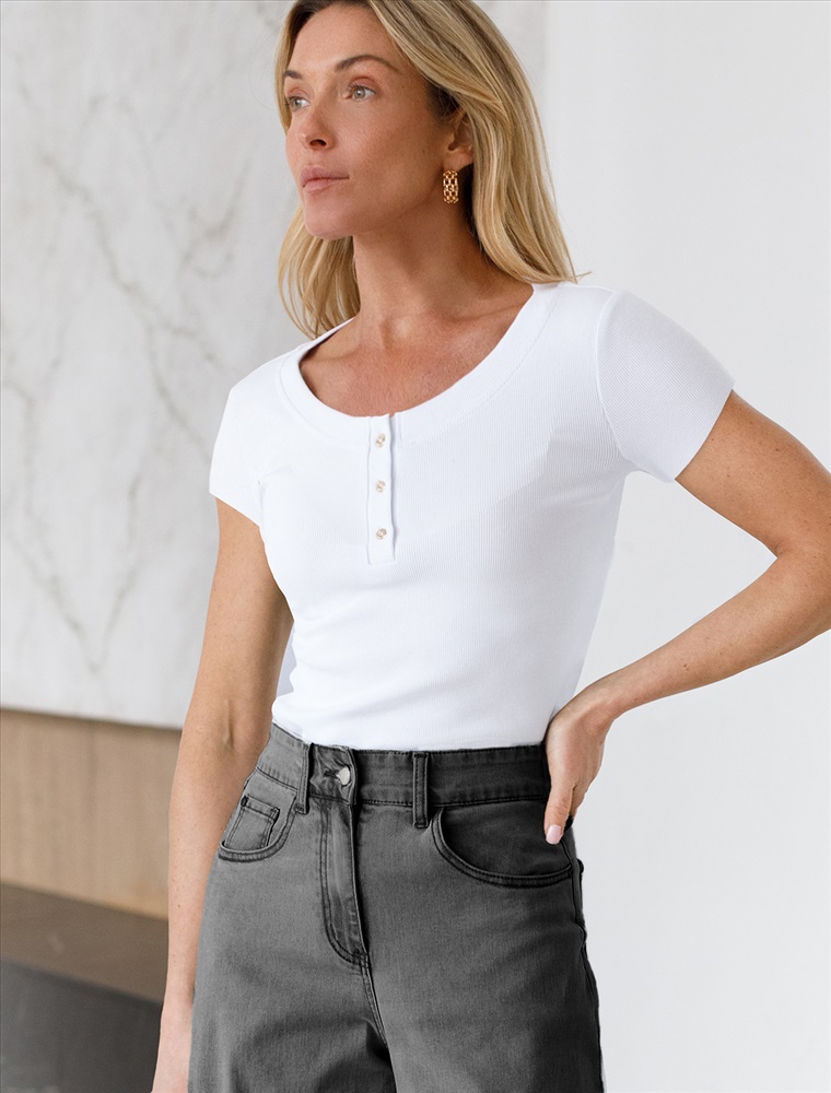 Параметры модели на первом фото: Рост 172, бюст 88, талия 64, бедра 88 Футболка выполнена из трикотажа в широкий рубчик. Модель с квадратным вырезом дополнена декоративными пуговицами. Эластичный хлопковый трикотаж сидит по фигуре, не сковывает движений и очень комфортный в носке. Фактура вертикальных полос визуально стройнит и вытягивает силуэт. Базовое изделие хорошо впишется в любой гардероб. Идеально подходит для многослойных образов.