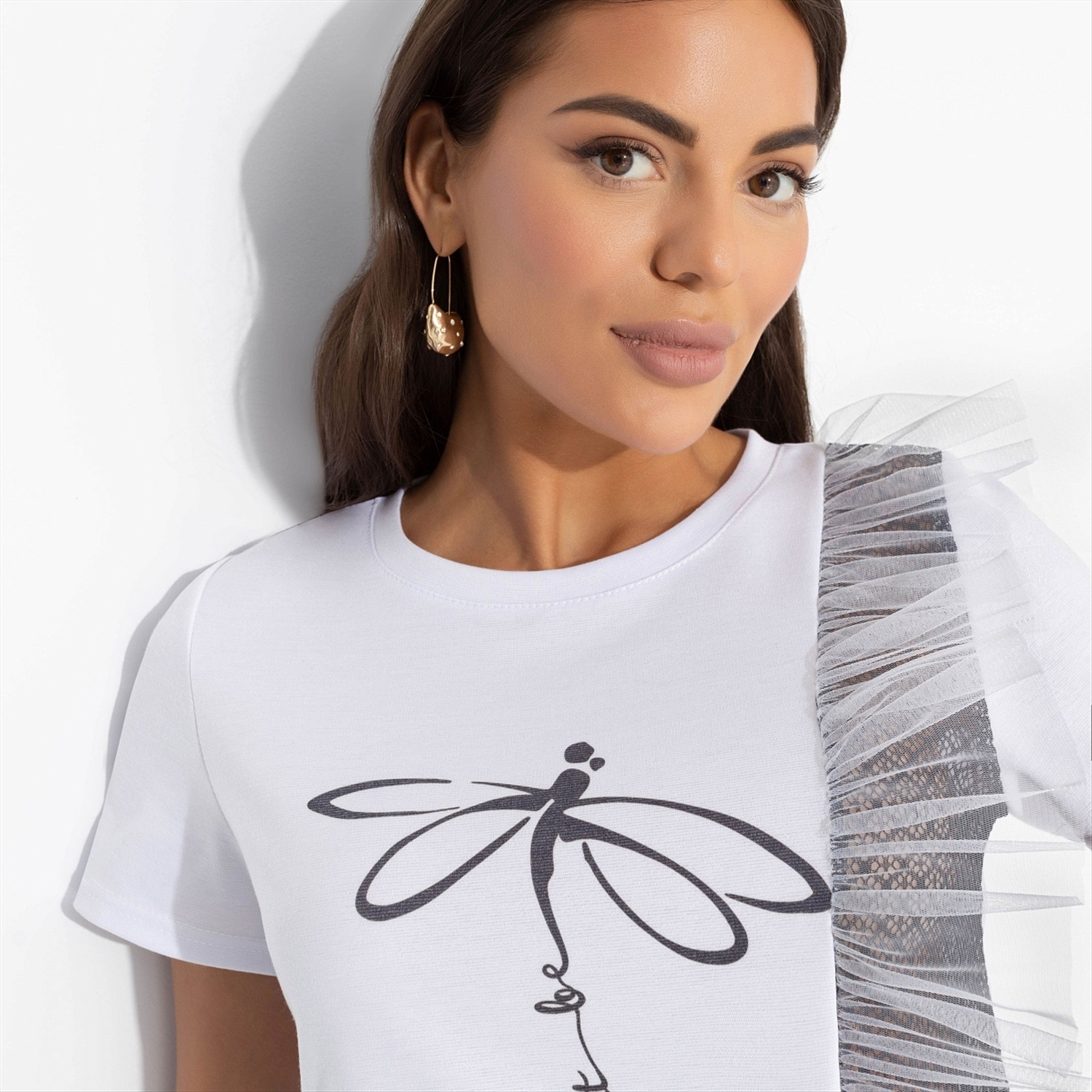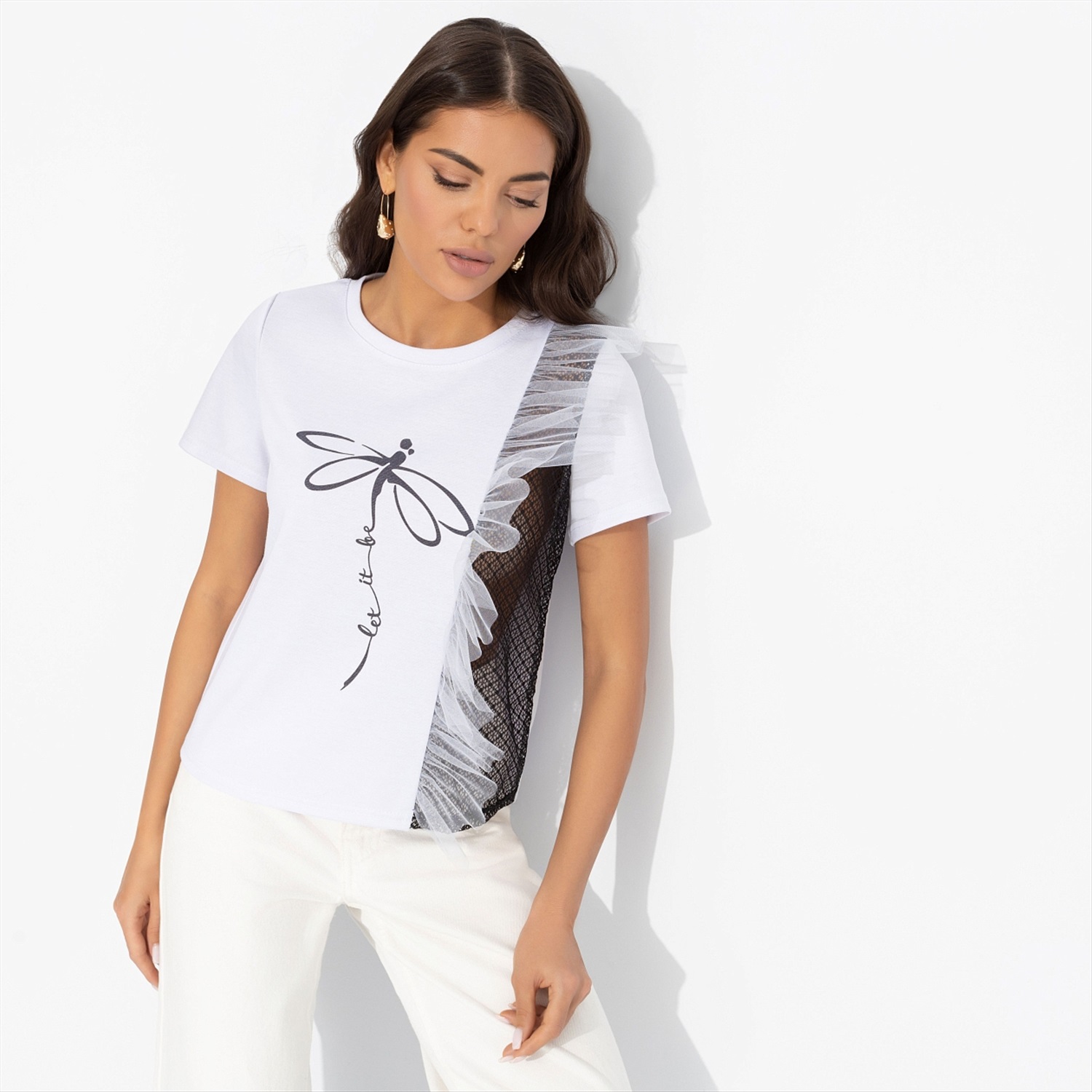 По пути с работы вы забрали ребенка из школы, отвели его в музыкальный кружок. Пока он музицирует, купили продукты, а потом вместе приготовили ужин. Позвонили маме, погладили рубашку мужу. Вы - молодец! Поблагодарите себя покупкой футболки от ЧАРУТТИ. Комфорт в высшем проявлении, вы это заслужили. Футболка классического кроя. Принт напечатан на ткани. Изделие дополнено объемной рюшей из сетки и декоративной прозрачной вставкой из тонкого кружева.
