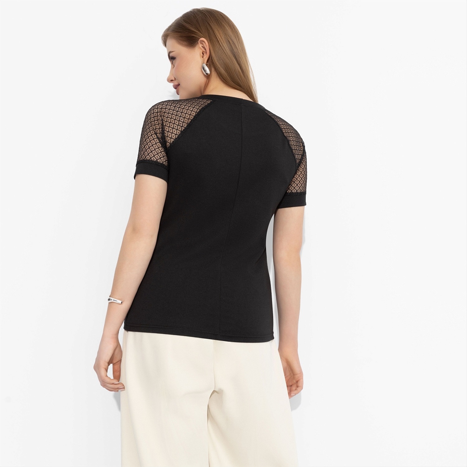 Вы с подружками решили устроить фотосет. Ты сначала хотела отказаться, но решилась. Надела футболку от ЧАРУТТИ в черном цвете с элегантным акцентом на плечи. Отгадайте, чьё фото набрало в социальных сетях больше всего лайков?! Футболка классического силуэта. Рукава оформлены тонким кружевом. Ххорошо смотрится в заправленном виде и навыпуск.
